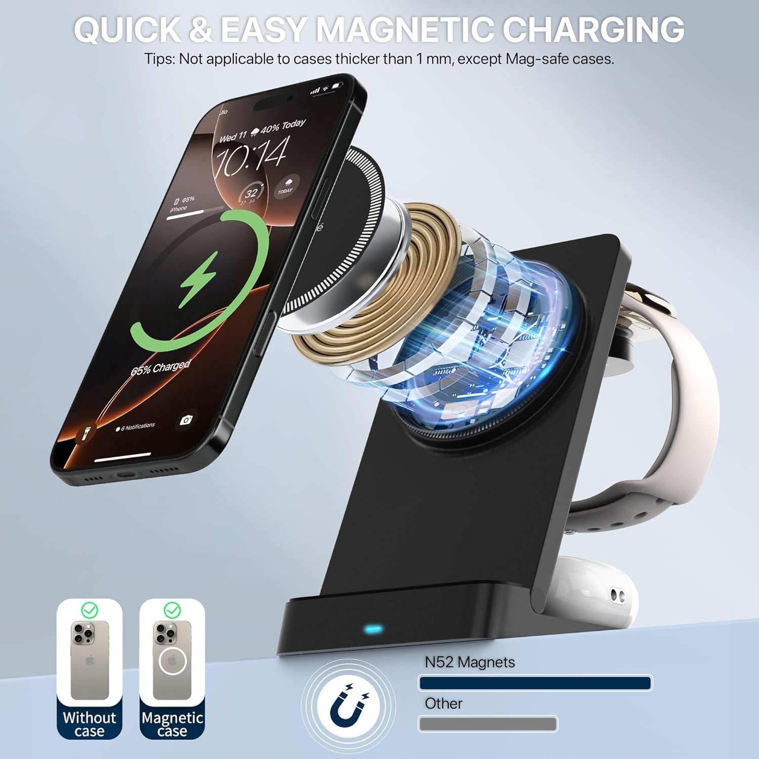 【Widely Compatible】-This Magnetic Wireless Charger is compatible with mobile phones: iPhone 17/17 Air/17 Pro/17 Pro Max, iPhone 16/16 Plus/16 Pro/16 Pro Max, iPhone 15/15 Plus/15 Pro/15 Pro Max, iPhone 14/14 Plus/14 Pro/14 Pro Max, iPhone 13/13 Pro/13 Pro Max/13 Mini/iPhone 12/iPhone 12 Pro/iPhone 12 Pro Max/iPhone 12 mini; compatible with iWatch 1/2/3/4/5/6/7/SE/ Ultra; compatible with Airpods 3/1/2/Pro.