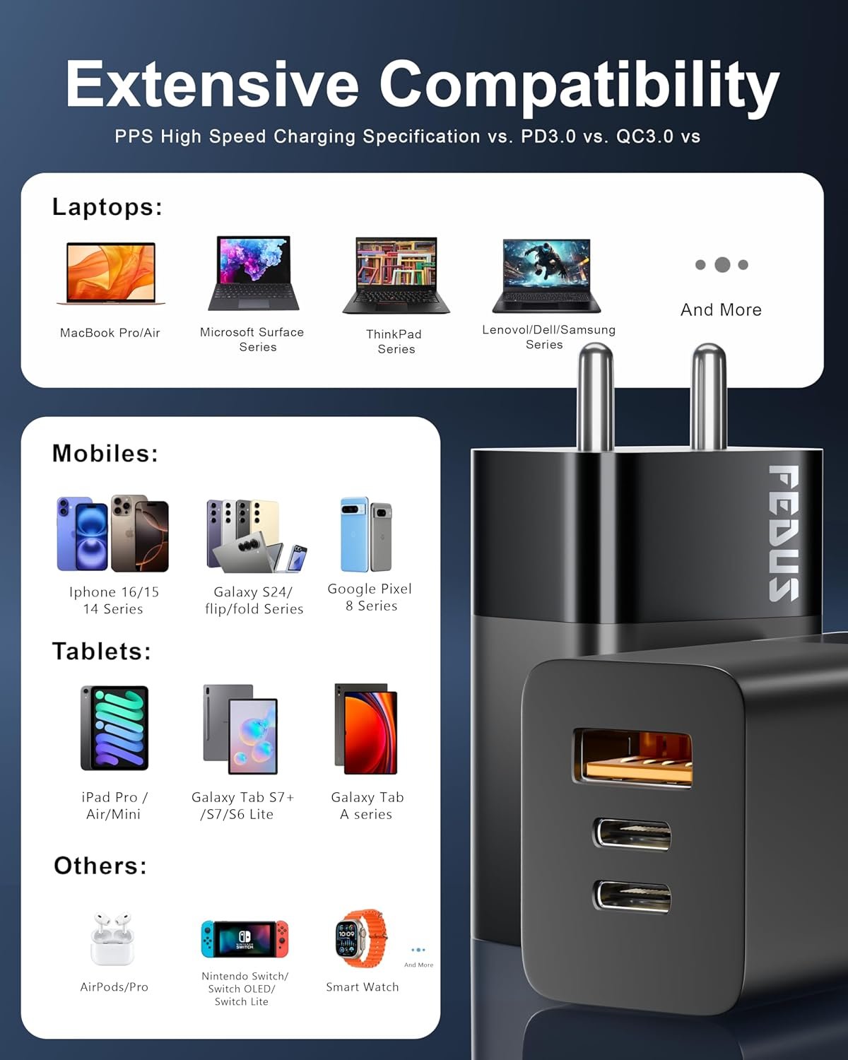 ▶VERSATILE CHARGING SOLUTION: Compatible with many devices, including tablets, laptops, portable monitors, and smartphones. With its wide compatibility, Stay powered up and connected effortlessly with this versatile charger, Support PD 3.0, QC 4/3.0/2.0, WARP, AFC, SCP, FCP, PPS USB C Fast charging protocols For HP, Acer, Samsung, Steam Deck, MacBook, MacBook Pro, MacBook Air, Laptop, phone, Switch, tablets, and 1000+ more Type C pwer devices(100W/65W/45W/ 30W/ 29W/ 18W/ 15W etc)