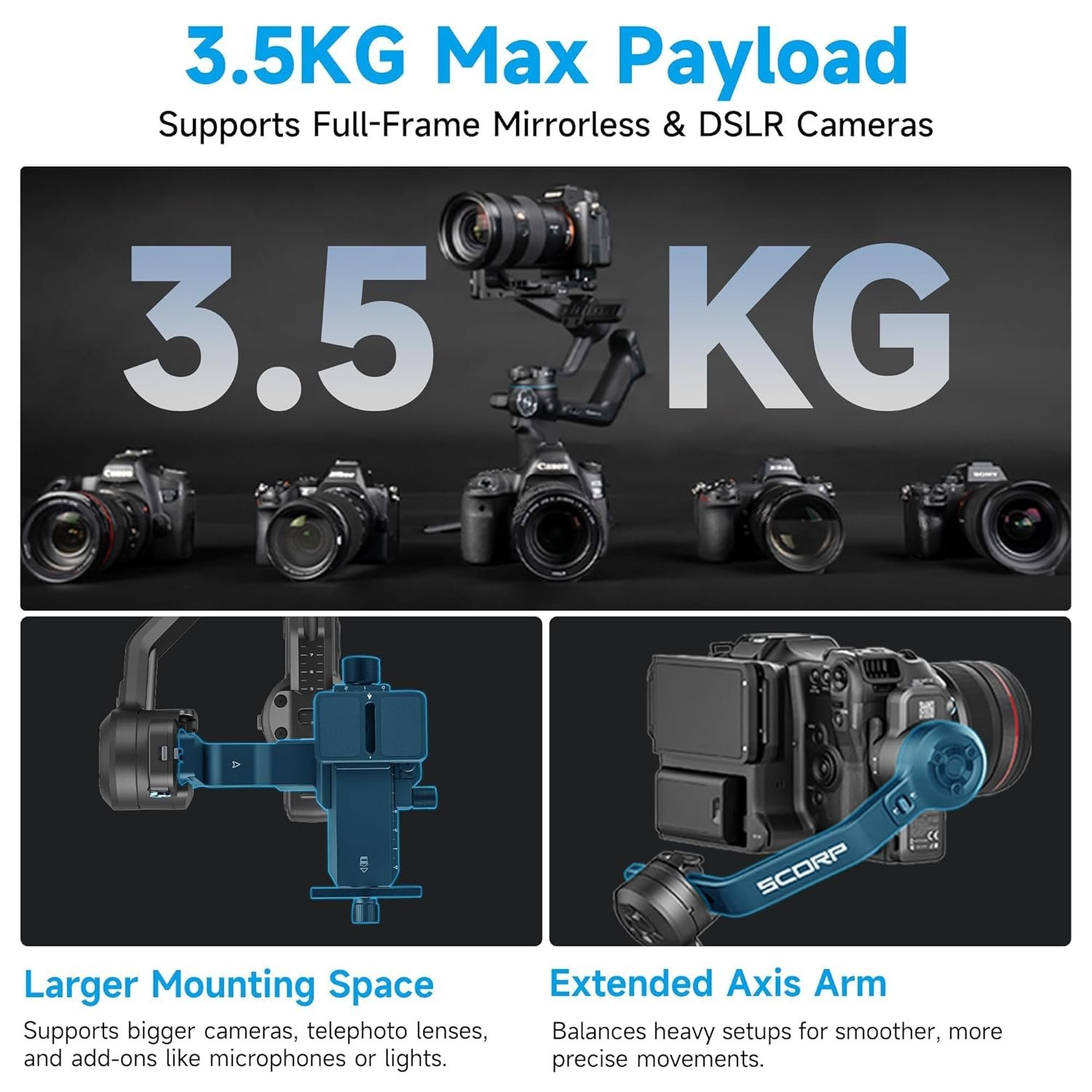 Powerful 3.5KG payload capacity: FeiyuTech SCORP-C2 Camera Stabilizer equipped with high-torque motors, compatible with Sony A7 series, Canon and Nikon full-frame mirrorless and DSLR cameras