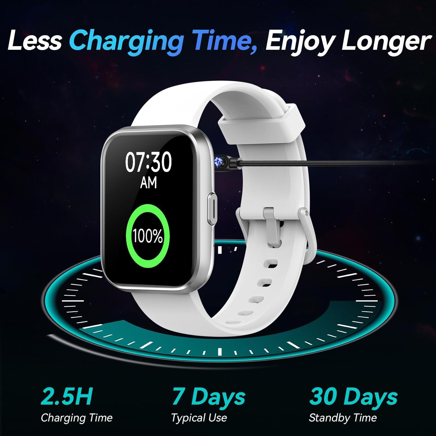 【Multi-Functions & 7 Days Battery Life】More than Fitness/Health watch, it boasts a range of other features, including SMS and Message Notifications, Flashlight, Weather Forecasts, Music/Camera Control, Alarms/Stopwatch/Timer, Motion Recognition, Breather Guide, Find Your Phone ect. With quick 2.5 hours of charging, the smartwatch can last 7 days of typical use and up to 30 days of standby time. Say goodbye to the hassle of daily charging!