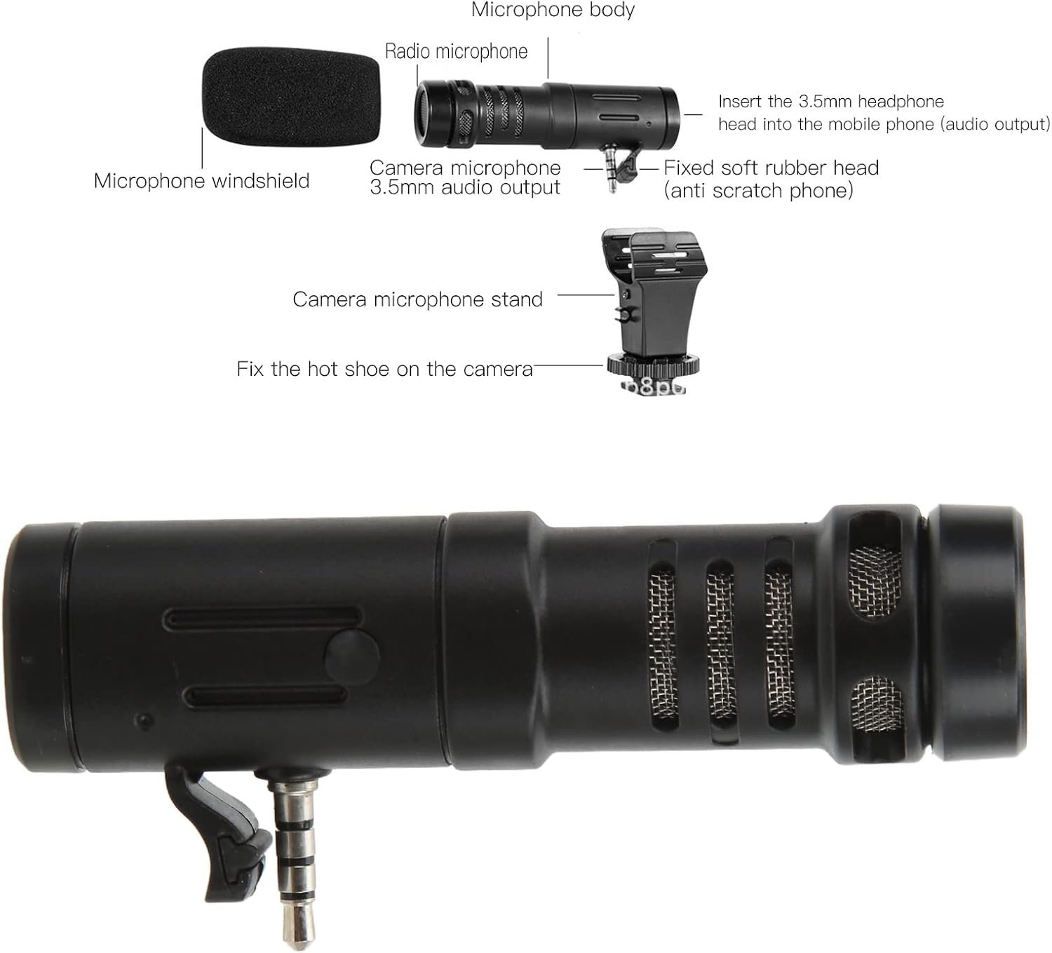 Item Type: Microphone Material: ABS Color: Black Weight: Approx. 53g/1.9oz One Way Feature: Single Directivity x1 Access Method: 3.5mm Microphone Jack, Headphone Plug Access End Inserted Power Supply Mode: External Power Supply Frequency Response: 100-16000Hz Sensitivity: -42±3dB Rl=680Ω Vs1.5 (1khzdb=1/Pa) Output Impedance: 1-2.2KΩ Current Consumption: ax.0.5mA Voltage: 1V-10V Maximum Sound Pressure: 110dB S.P.L Sensitivity Reduction: 2.0V-1.5V Sensitivity Change is Less Than 3dB