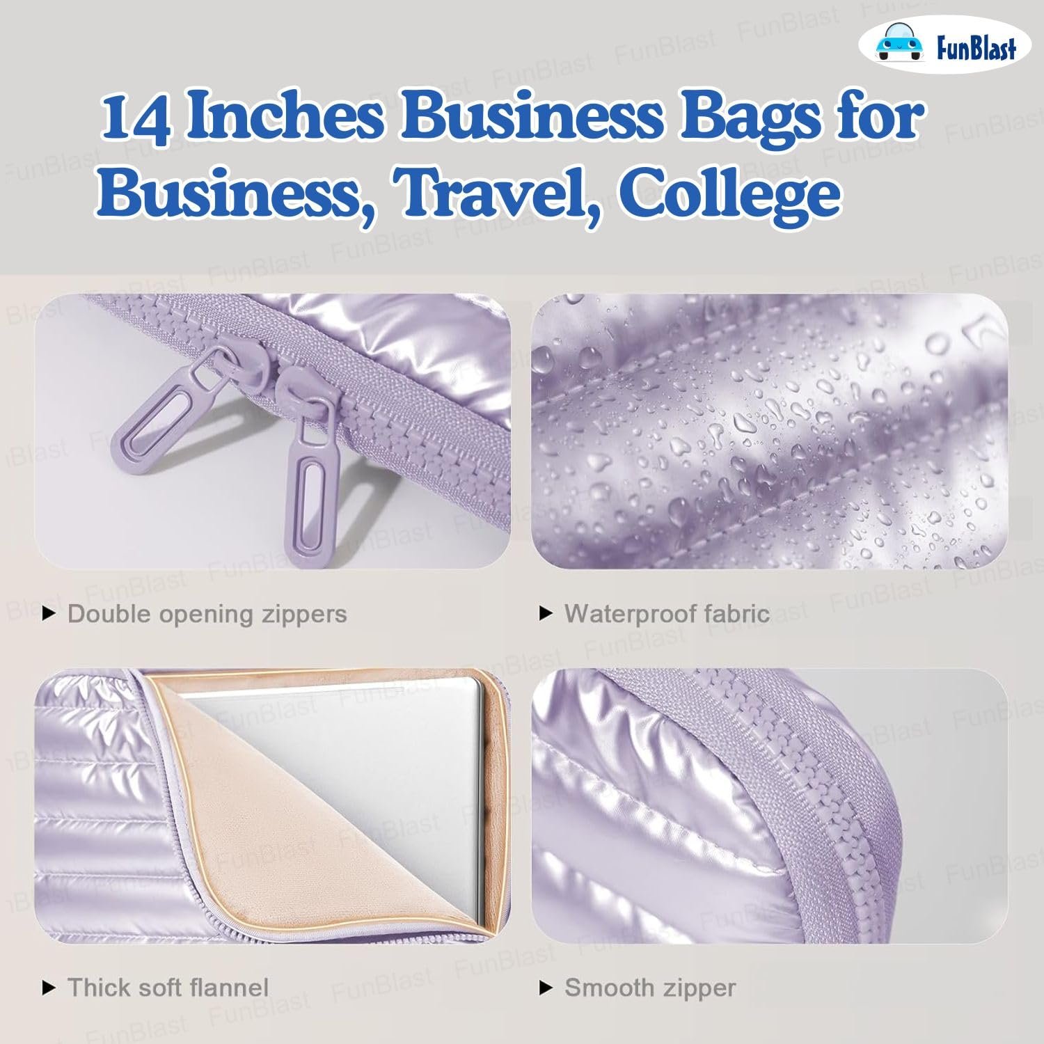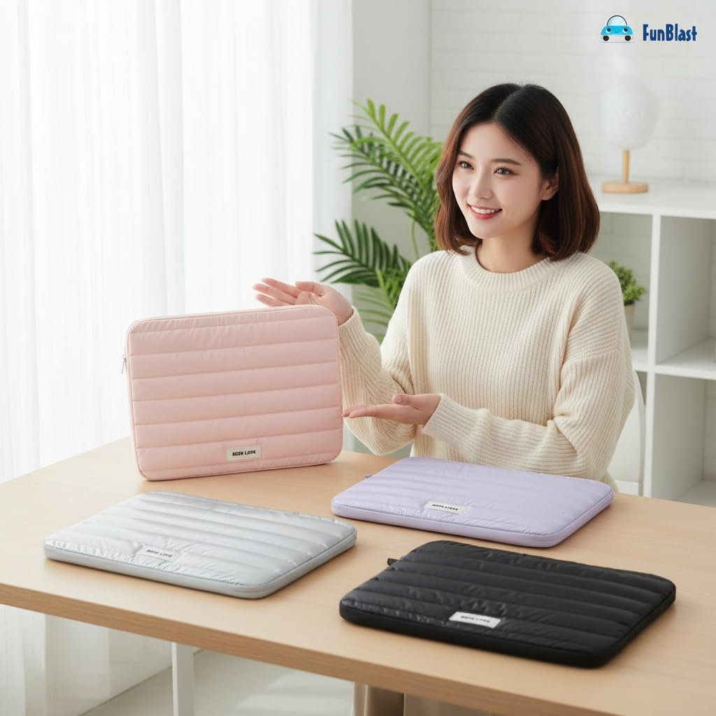 FunBlast Padded Laptop Cover Bag – Laptop Sleeve Bag, Multifunctional Shockproof, Waterproof Laptop Case, 14 Inches Business Bags for Business, Travel, College Multifunctional & Stylish Design: FunBlast Portable Laptop Bag offers a perfect blend of fashion and function — ideal for business professionals, college students, and travelers. Shockproof Protection: Puffy padded design provides superior cushioning and absorbs impact, keeping your laptop safe from accidental drops and bumps. Lightweight & Easy to Carry: Designed with a soft, lightweight structure that makes it easy to carry in hand or inside your backpack or suitcase. Premium Quality Material: Made with durable, water-resistant polyester fabric that protects your devices from dust, scratches, and light splashes. Spacious & Organized: Suitable for 14-inch laptops, with extra compartments to store chargers, cables, mouse, notebooks, and other accessories neatly.
