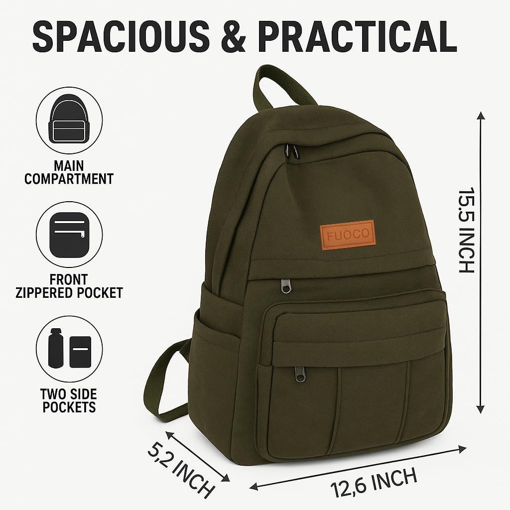 Upgrade your everyday carry with the FUOCO Canvas backpack college bag for women, built for students who want style, comfort, and practicality in one bag. Made with durable canvas material and padded shoulder straps, this backpack is designed for college students, school-going boys, girls, and office commuters. The roomy interior easily fits books, notebooks, lunchbox, and daily essentials, while the dedicated laptop sleeve safely holds a 14–15.6 inch laptop, making it a perfect laptop backpack bag for women and students. Multiple zipper pockets offer quick access to your phone, pens, charger, or makeup pouch, helping you stay organized throughout the day. Its lightweight yet sturdy design makes it ideal for college use, school use, office use, tuition classes, casual outings, or weekend travel. The stylish exterior fits global fashion trends, making it one of the best college bags for girls, school bags for boys 15+ age, and women’s college backpacks latest designs. Whether you’re heading to university, the library, your coaching center, or a short trip, this FUOCO backpack keeps your essentials secure and your style on point.