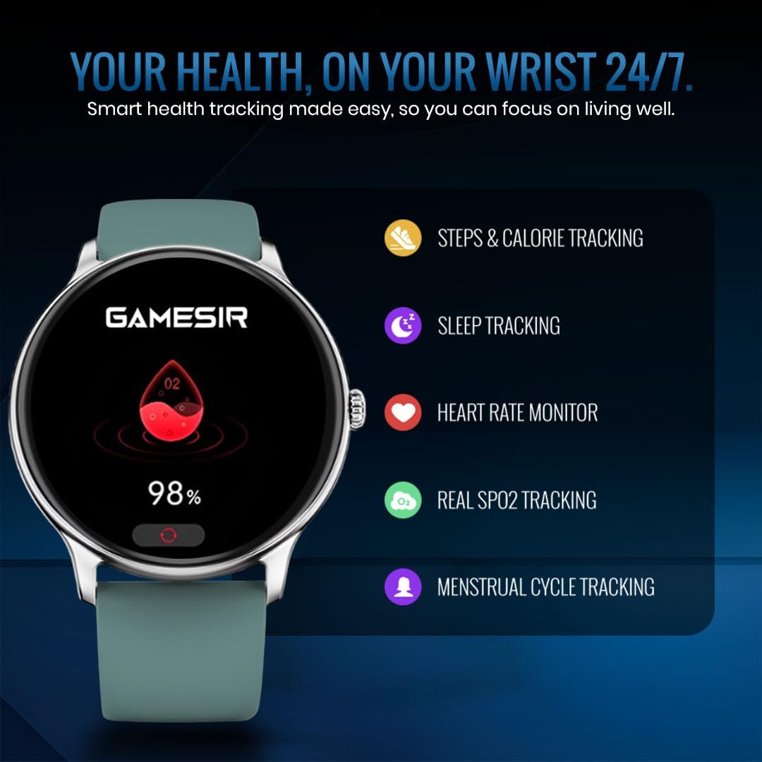 GameSir Glavito Round Dial Smartwatch with 1.49″ AMOLED Display, 100+ Sports Modes, IP67, Bluetooth Calling, Functional Crown Control, Health Tracking, 100+ Watch Faces for Men & Women (Light Green)