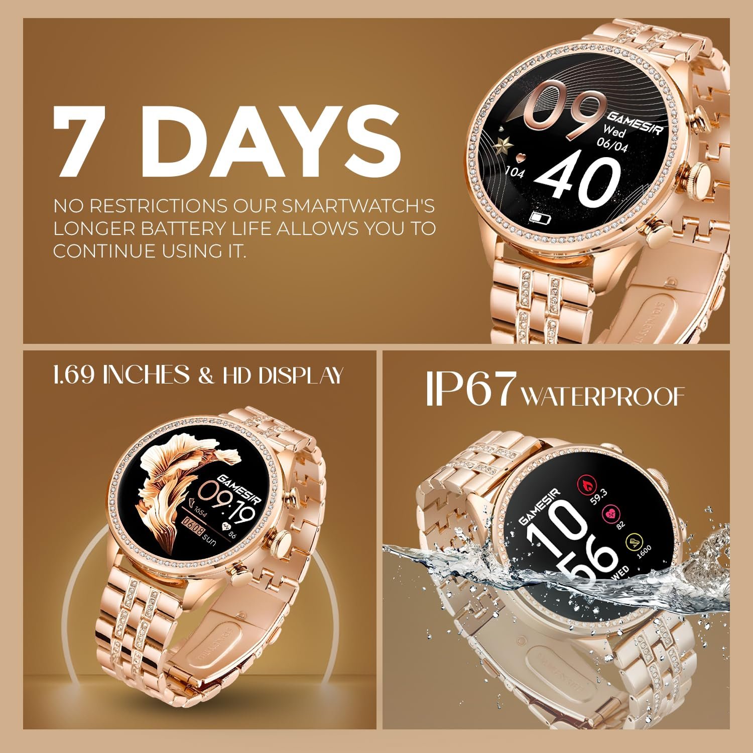 GameSir Premium Luxurious Gen 9 Smartwatch, HD Display Gold Metal Strap & Activity Tracker, Bluetooth Calling, Customizable Watch Faces, Water Resistant Smartwatch for Women & Girls(Rose Gold)