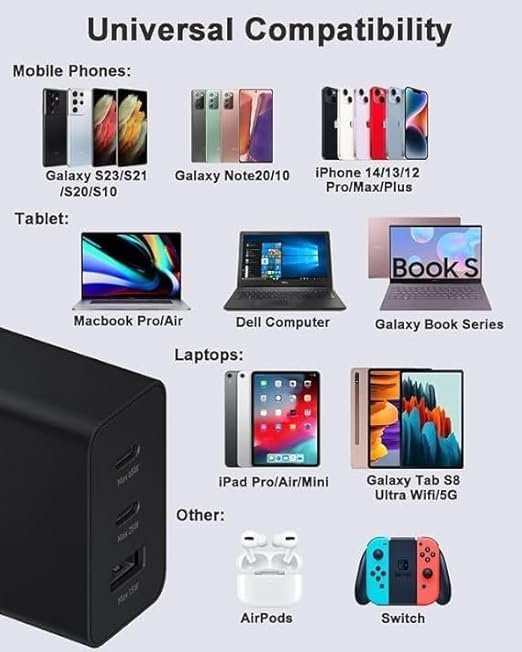 GILERINS GILERINS 65W 3-Port Super Fast Charging Wall Charger for Sam sung Galaxy S23 S22 S21 S20 Ultra Plus S22+ S23+ S21+, Galaxy Tab S8 S7 5G FE S7+ S8+, Note 10 Plus , Note 20, Galaxy S22 65W Power Trio Adapter lets you charge three devices — all at the same time! Experience the power and versatility of a triple-port charger*. Go for the fast charge—with speed, stability and power; Power up a wide range of devices in a snap with Super-Fast Charging** and up to 65W total power output***. Maximize your charging time; Power up a wide range of devices from earbuds and laptops to phones and tablets. *Charging cables sold separately; use only -approved chargers and cables. 65W charging requires a USB-C 5A cable, 25W charging requires a USB-C cable and 15W charging requires a USB-A cable. To avoid injury or damage to your device, do not use incompatible, worn or damaged batteries, chargers or cables. **Super-Fast Charging (SFC) supported with Galaxy smartphones with 25W charging capacity or above and other SFC capable devices such as higher. SFC only capable with the C-type ports of the charger. ***Adapter can charge 3 devices simultaneously for a total of 65W power supply. Charging speeds vary depending on the number of devices. If the device has a lower charging capacity, then the power output will adjust down. 45W to 65W charging requires a USB-C 5A cable, 25W charging requires a USB-C 3A cable and 15W charging requires a USB-A cable (sold separately). When charging a single device with that charging capacity or higher, the power outputs of each port are as follows Type-c1:65W Max ,Type-c2:65W Max,USB-A1:20W Max. When 2 devices are connected simultaneously the maximum power supply of each output will be: 1、Type-c1+Type-c2 45W+20W 2、Type-c2+USB-A1 45W+20W 3、Type-c2+USB-A1 Share 5V4.5A 22.5W MaX When 3 devices are connected simultaneously the maximum power supply of each output will be: TYPE-C1+TYPE-C2+USB-A1 (C1:45W)+(C2:5V1.5A)+