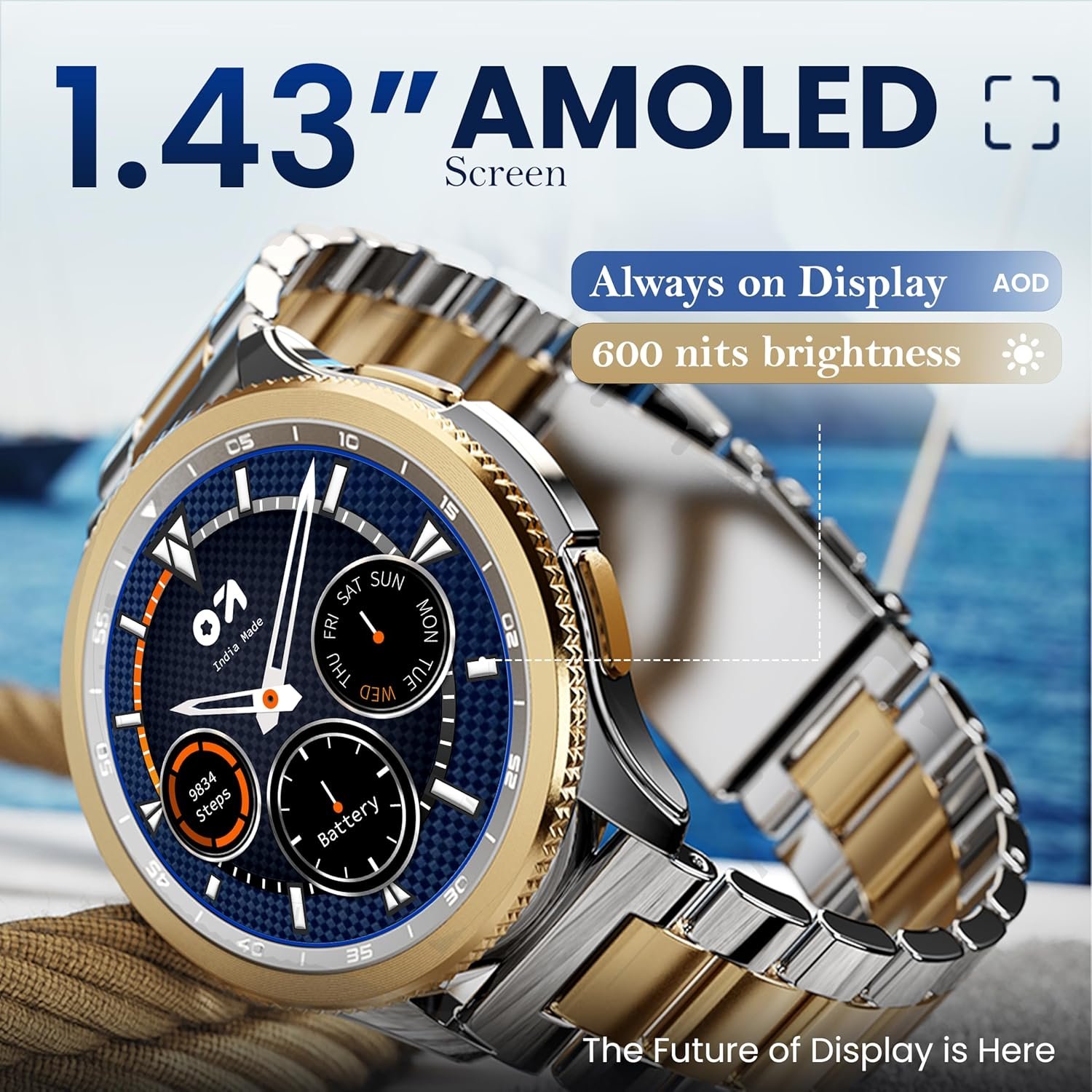GOBOULT Newly Launched Pyro Smartwatch 1.43”AMOLED Screen, BT Calling 5.3,600Nits Brightness, IP68,150+Watchfaces,120+Sports Modes, AI Voice Assistant, SpO2 Monitoring (Platinum Gold)