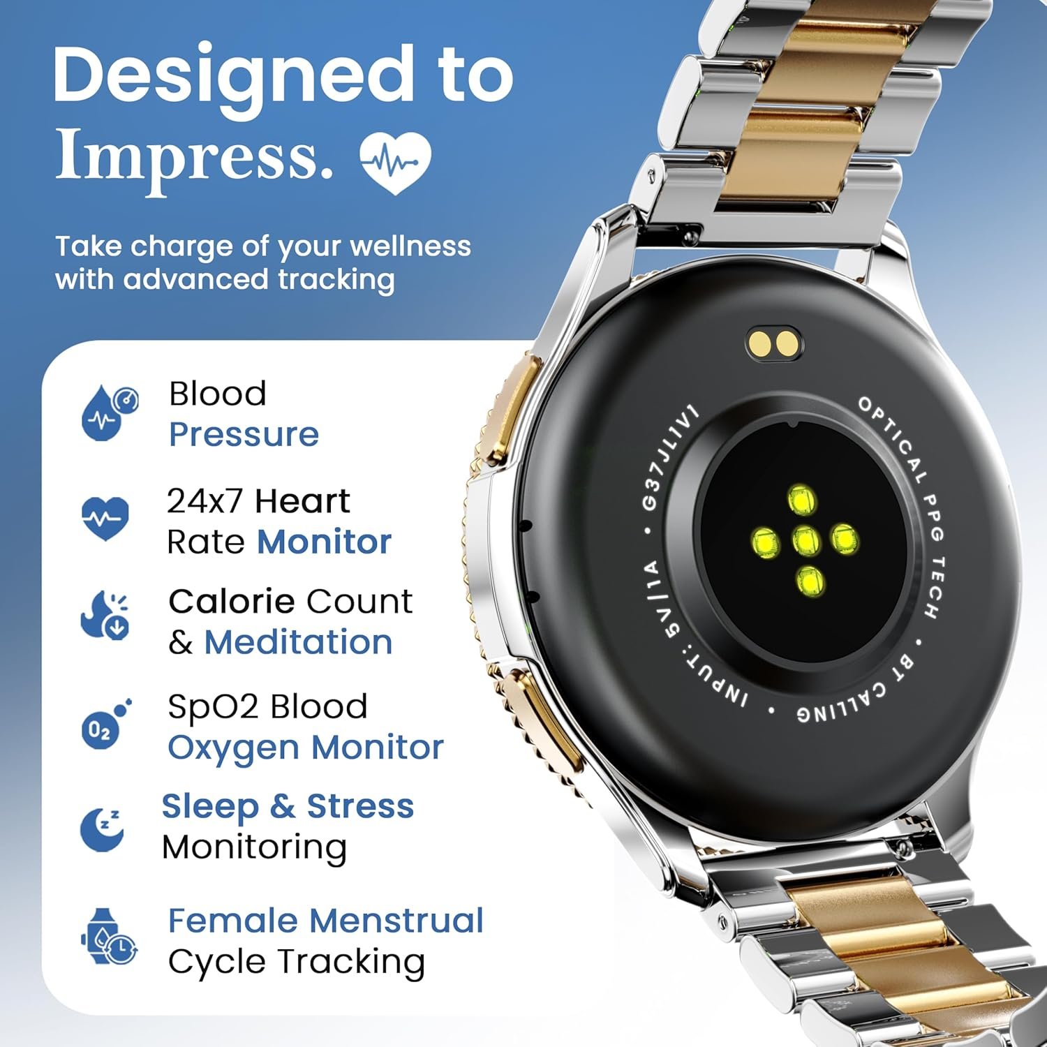 The GOBOULT Pyro Smartwatch blends style, functionality, and cutting-edge technology in one sleek package. Its 1.43 inch AMOLED display offers 600 nits brightness and a 466×466 resolution for crystal-clear visuals and deep contrasts, featuring an Always-On Display. Navigation is effortless with the rotating dial. Stay connected via Single Chip Bluetooth Calling with dedicated speaker & mic for hands-free conversations. Crush workouts with 120+ sports modes, and monitor health 24×7 with heart rate, blood pressure, SpO2, stress, sleep, and menstrual cycle tracking. Customize with 150+ cloud-based watch faces. IP68 water resistance ensures durability, while smart features like AI voice assistants, remote camera, weather updates, and world clock enhance productivity. Available in Gunmetal and Gold-Silver stainless steel variants, the Boult Pyro is not just an accessory-its your ultimate everyday companion.