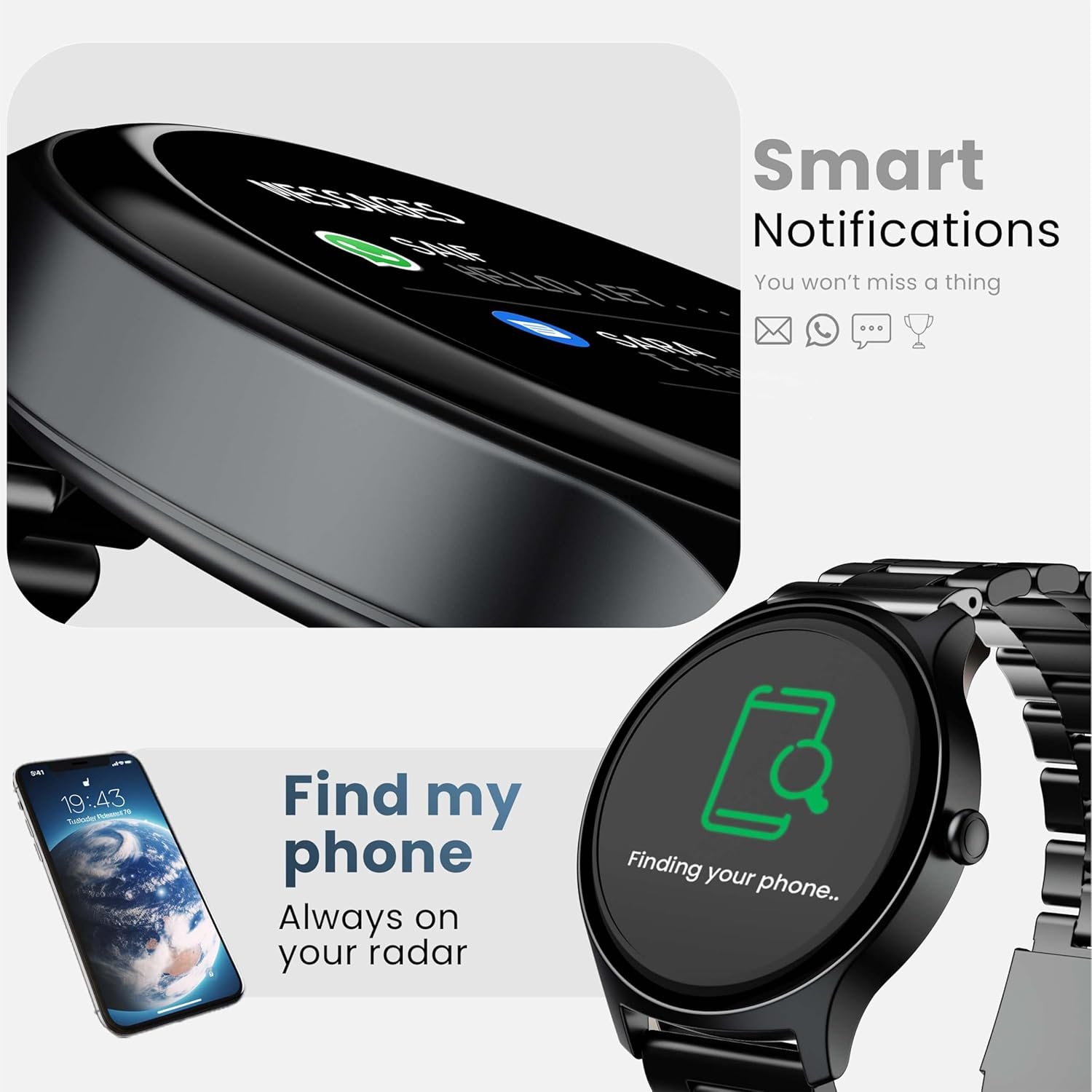 the watch looks premium and stylish display is bright and clear even in sunlight metal strap feels durable and gives a classy look battery lasts good for daily use all features work smoothly including calls and health tracking connecting with phone was easy and quick speaker output is loud enough fitness modes are many and useful for basic tracking overall good value for price if you want a smart looking smartwatch without spending much this one do the job well