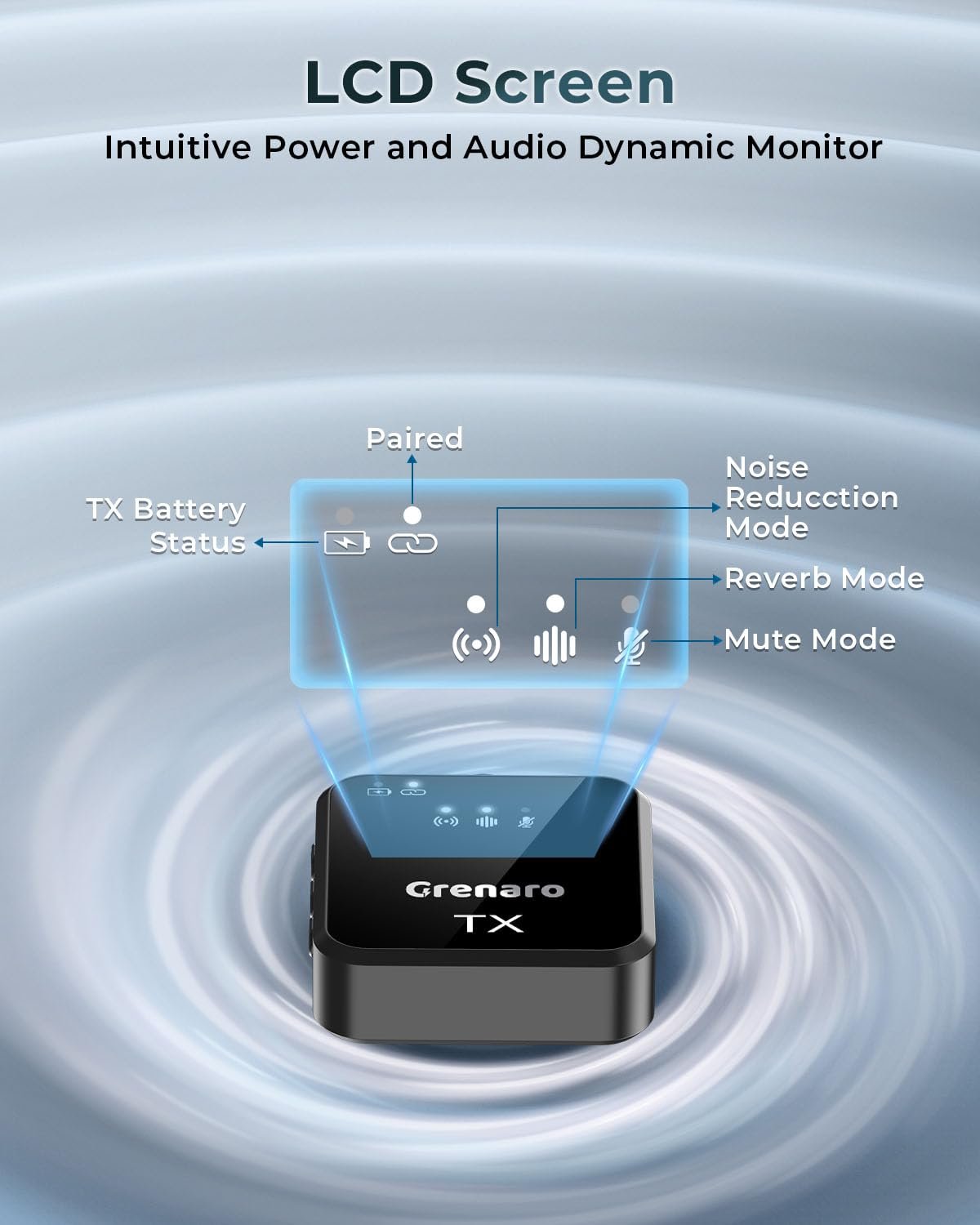 📊 Clear LED Display & 4 Professional Modes: The intuitive LED screen shows battery status, connection status, and active audio mode. Switch between Original Sound, Noise Reduction, Reverb, and Mute—perfect for wireless microphone for youtubers and podcasters needing quick adjustments mid-recording.