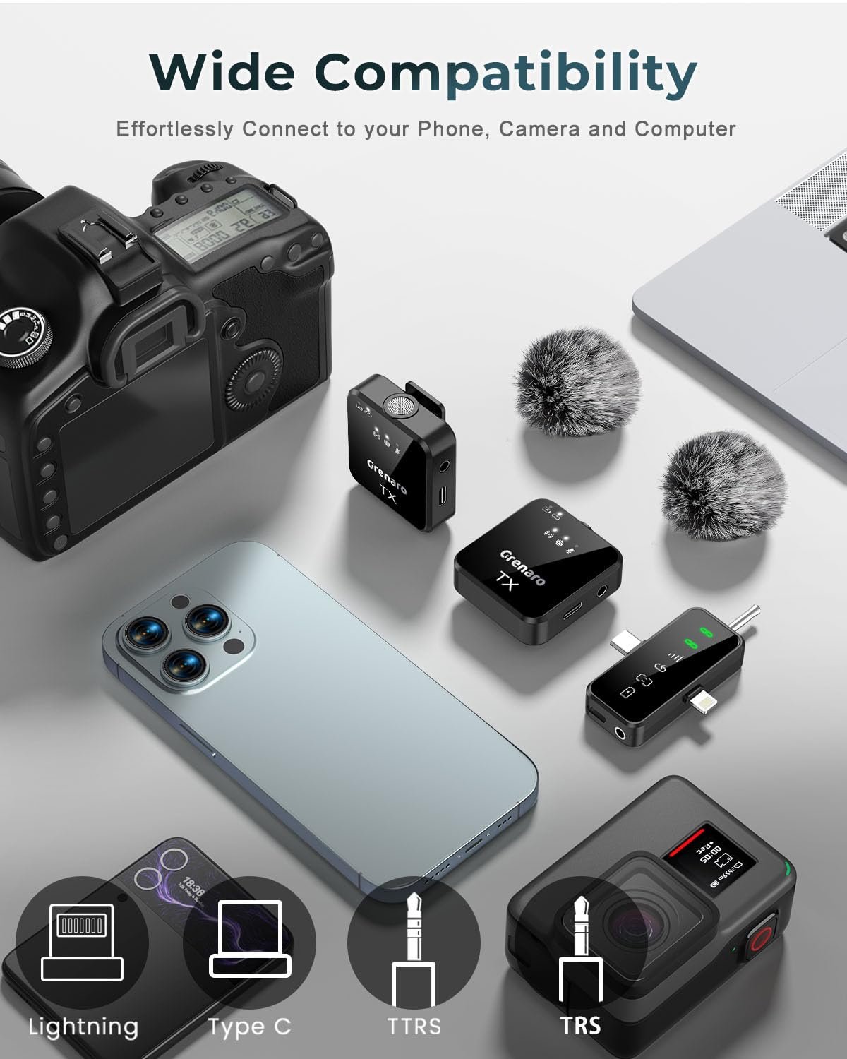 GRENARO 3-in-1 mic for YouTube Wireless for iPhone/Android/Camera – Microphone for Recording with LED Display, 164ft Range, Mute/Reverb/Noise Reduction for YouTube, Live Streaming, Vlogging