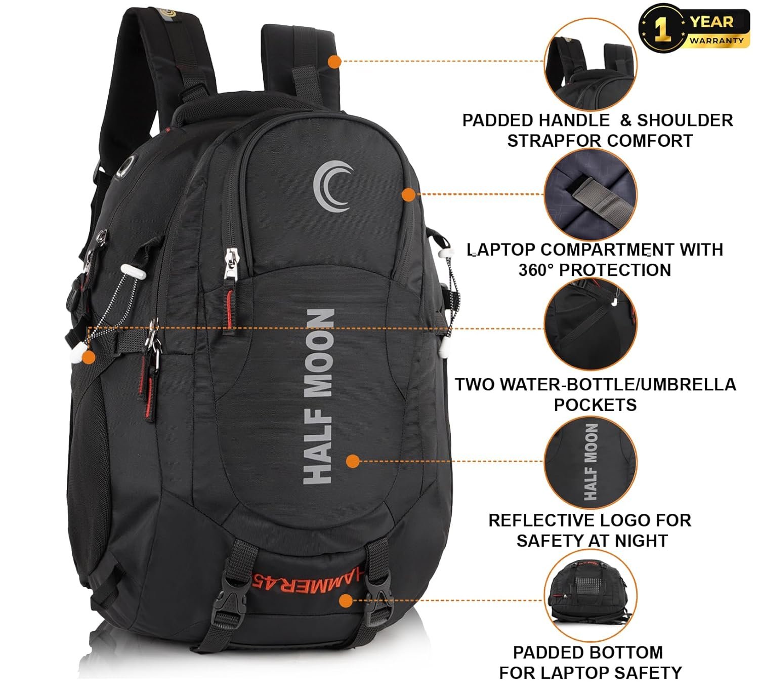 Half Moon 45L Hammer Waterproof Rucksack | With 17.3″ Laptop Compartment & Rain Cover | For Trekking, Hiking, Travel, For Men & Women