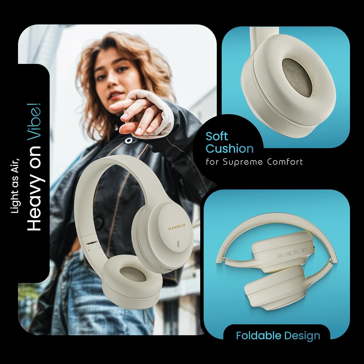 HAMMER Vibe ENC Bluetooth Headphone, 40mm Driver, Dual Pairing, 50hrs Playtime, Voice Assistant, BT V5.4, Game Mode, Soft Cushions, Lightweight Headphones for Music, Gaming and Calls (Beige)