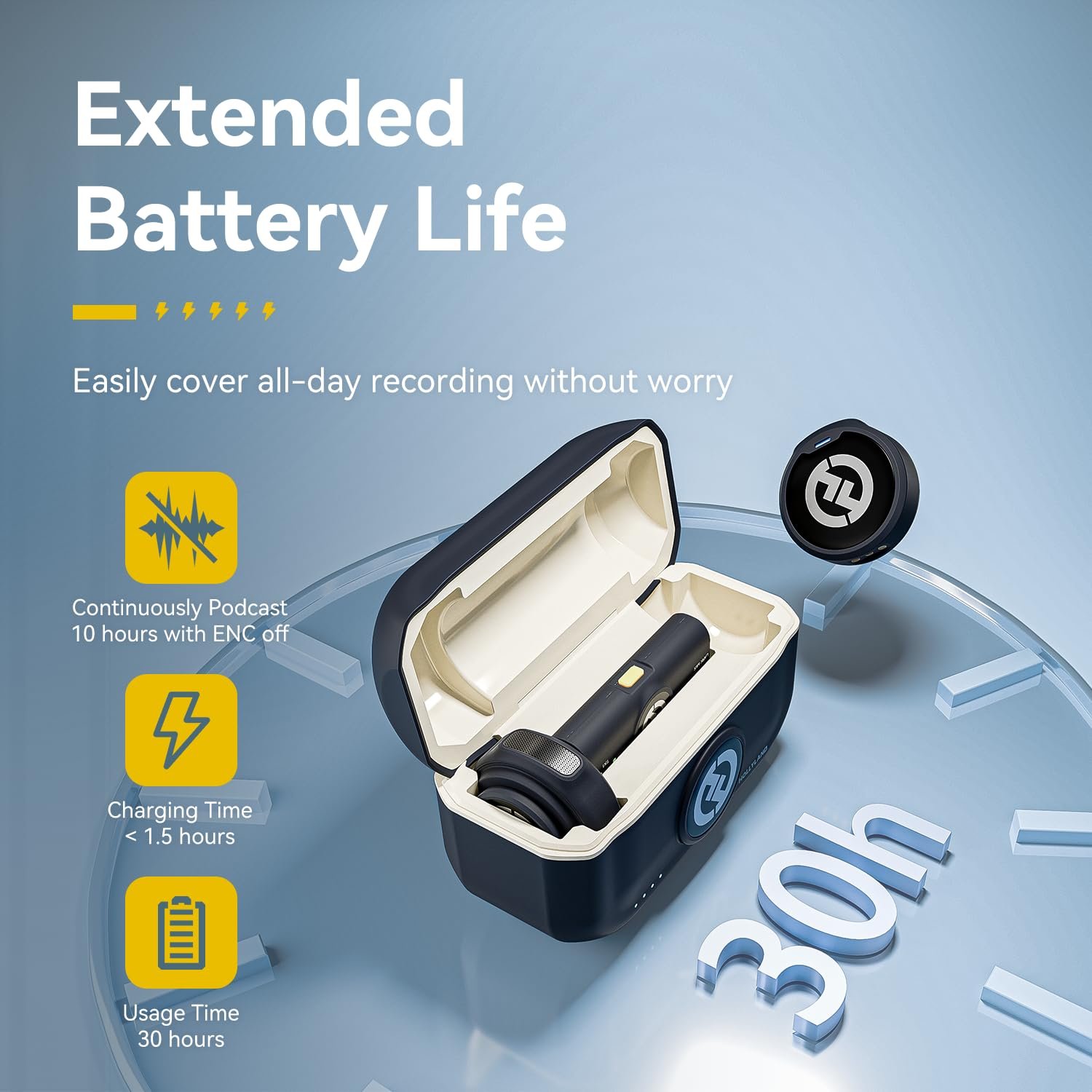 γExtended 30H Battery LifeγWith optimized power efficiency, the LARK M2 wireless microphone can work for up to 10H (with ENC off). The compact charging case can fully charge the entire set twice, and each charge takes less than 1.5H. With the charging case, the mobile version has a battery life of 30H. No more worrying about low battery situation.