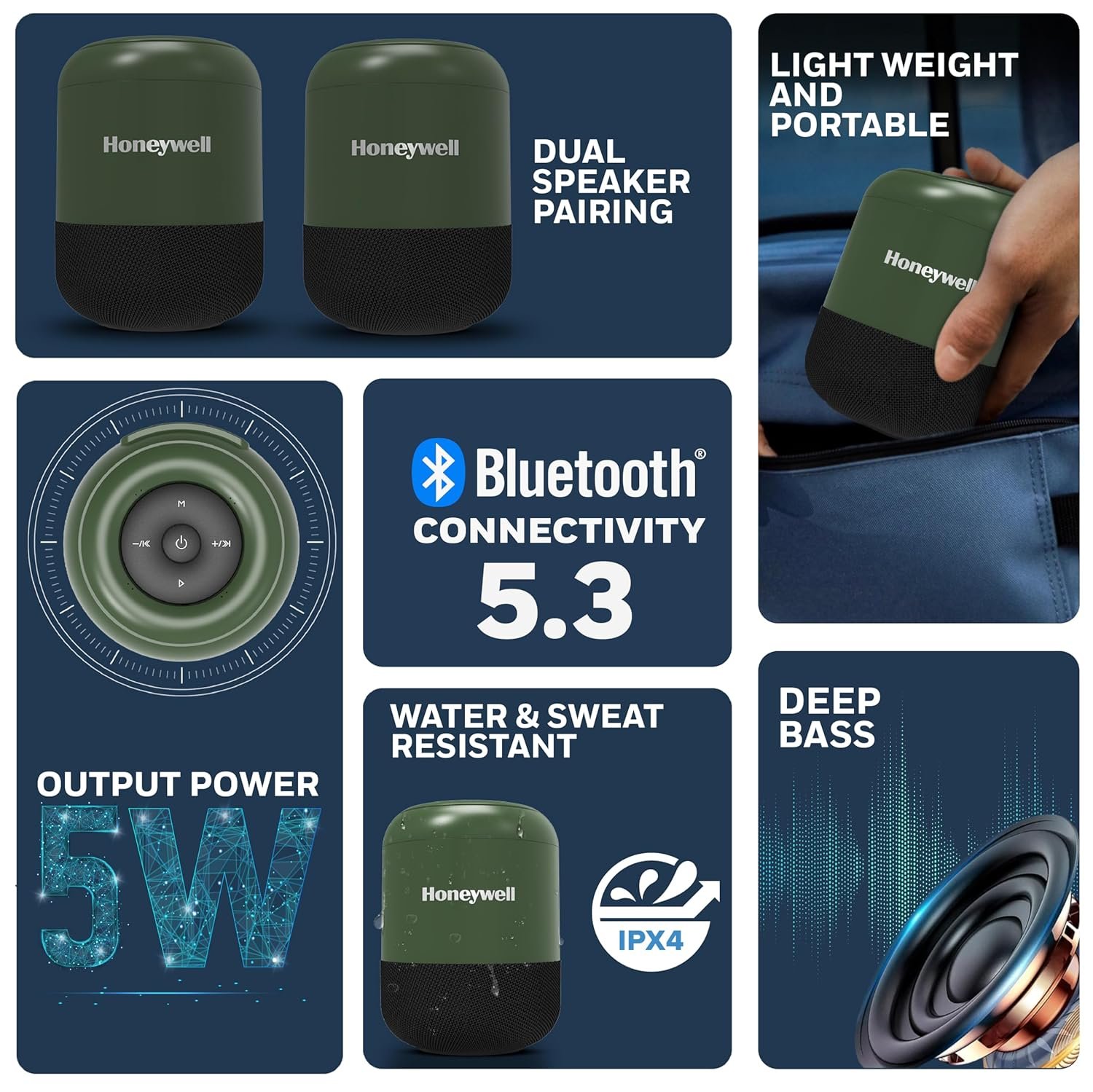 First of all, I am angry with the seller for sending me a unit with wrong color combo. I had ordered one with black top and olive green bottom, but was sent a unit with black top and dark green bottom. People have very low conscientiousness these days. Anyway, I didn’t want to go through the hassle of returning and decided to keep it. But have deducted one star for this.Now, coming to the speaker itself, I had ordered this very cheaply priced BT speaker after a lot of research. Based on YouTube videos I had found this Honeywell speaker to have a very open and dynamic sound. And I wasn’t wrong! When I fired it up, the sound I got was delightful. A very balanced and natural tone, with perfect dynamics. Don’t expect much bass, I don’t know where the low end gets cut, but don’t low bass say below 80 db). But, if like me, you’d be using it for vocal and acoustic tracks and podcasts what you’d get is very clear, full-bodied, and enjoyable listening experience. There is no boomy upper bass muddling up the mids. The mids and highs of this speaker are better than what you’d get in many costlier speakers.Take care where you place them, for their tonality depends on the surface which they use to produce the low end. I got the best result (I.e. most natural tone) when placed on solid wood table/stand. Avoid placing on glass or stone surfaces if possible, that would introduce a bit of undesired brightness to the sound.Overall, this is a fun little BT speaker. No issues in connecting or performing. Look well built too. The buttons on the top are mushy and need some push, but they work. It holds a decent charge too. I might get one more to pair them in TWS.