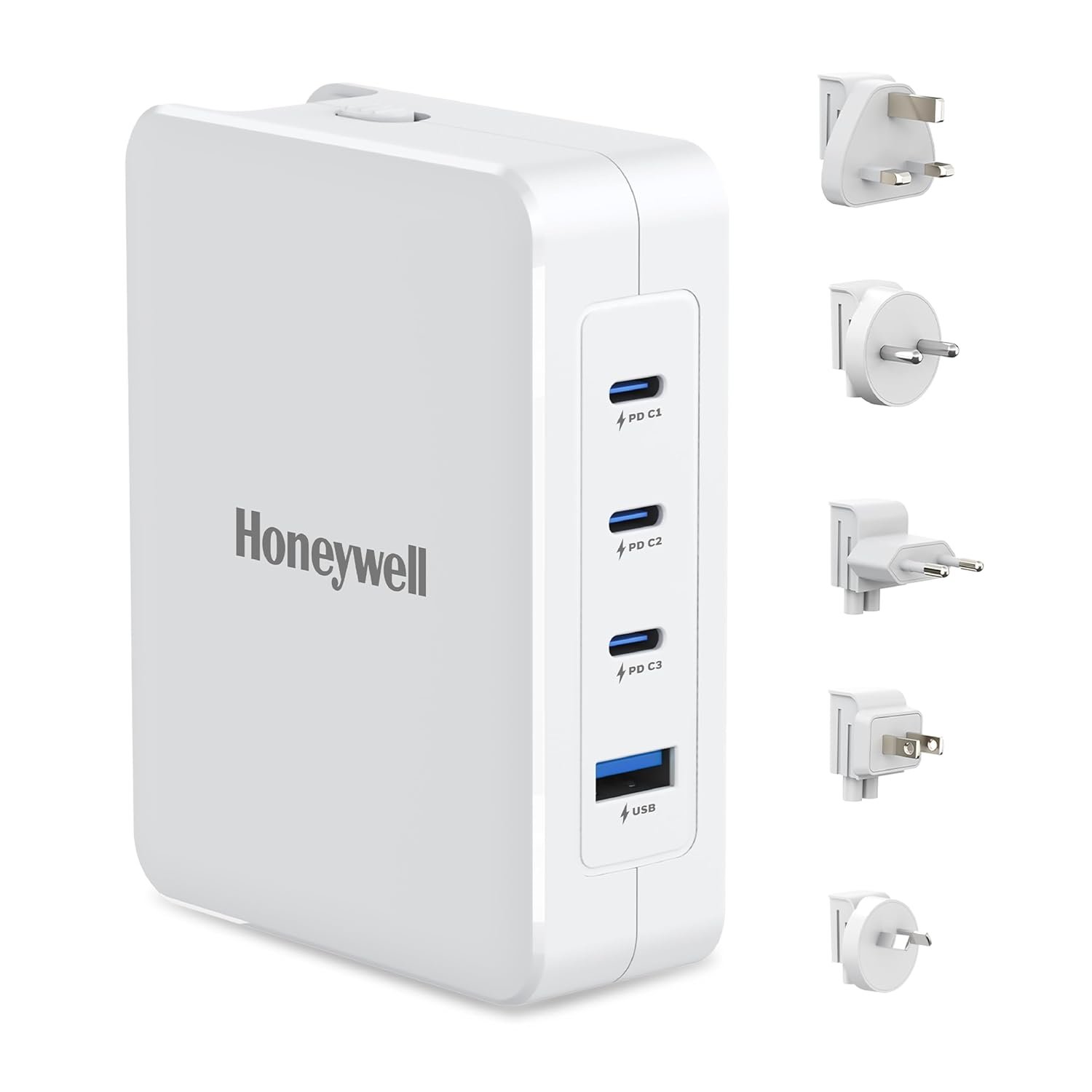 Honeywell Zest GaN 100W Charger:Honeywell Zest GaN wall charger with 100W Max 3 x Type C ports & 1x USB port. Switchable plugs make it a perfect universal charger with EU,UK,IN,US,CN Plugs