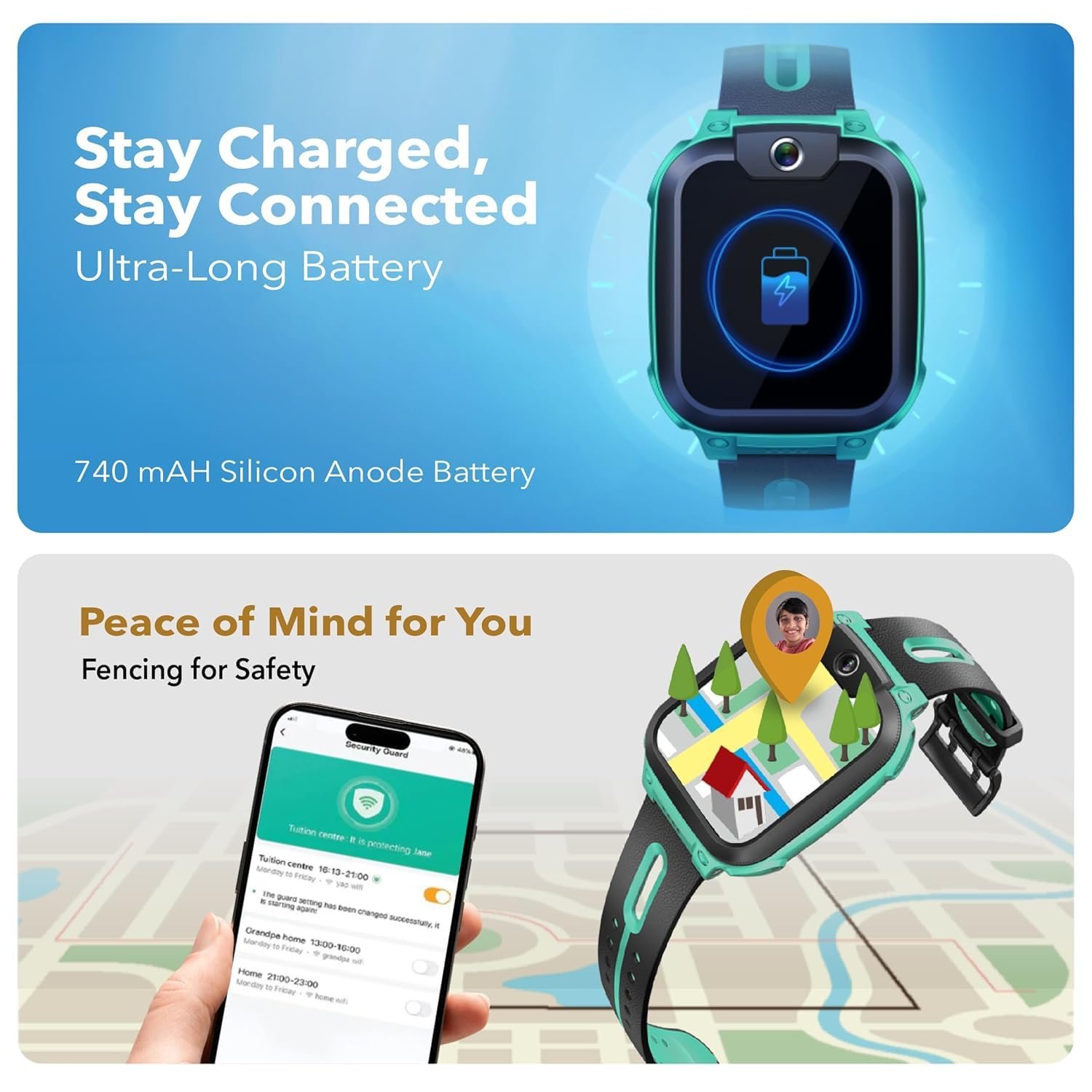 It comes with useful features like video calling, GPS tracking, and good sound quality. The battery life is also quite good, making it a great value for money. You can easily track your child’s activities, and the best part is that it’s waterproof. Definitely a good buy for kids!