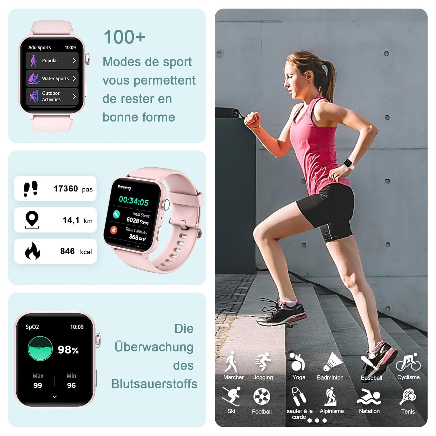 【Over 100 Training Modes】Choose from over 100 different training modes on your smart watch, such as yoga, cycling, running, hiking, walking, climbing, rugby, fitness exercises, yoga, badminton, tennis, etc. The smart watch can track your training sessions in detail, including Steps, calories burned, distance traveled and other important fitness information.