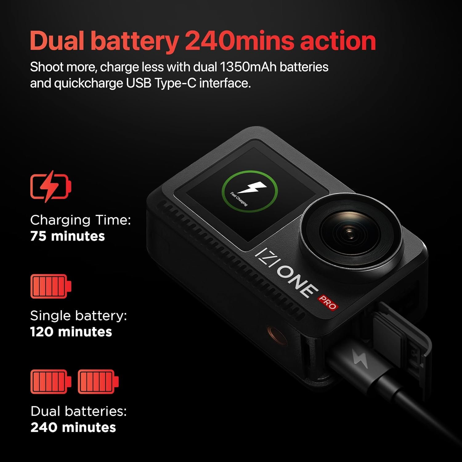 240-Min Runtime + Type-C Fast Charge : Shoot longer and recharge quicker. With dual 1350mAh batteries, enjoy up to 240 minutes of recording. The Type-C port keeps your cam powered for road trips, treks, or extended content capture days.