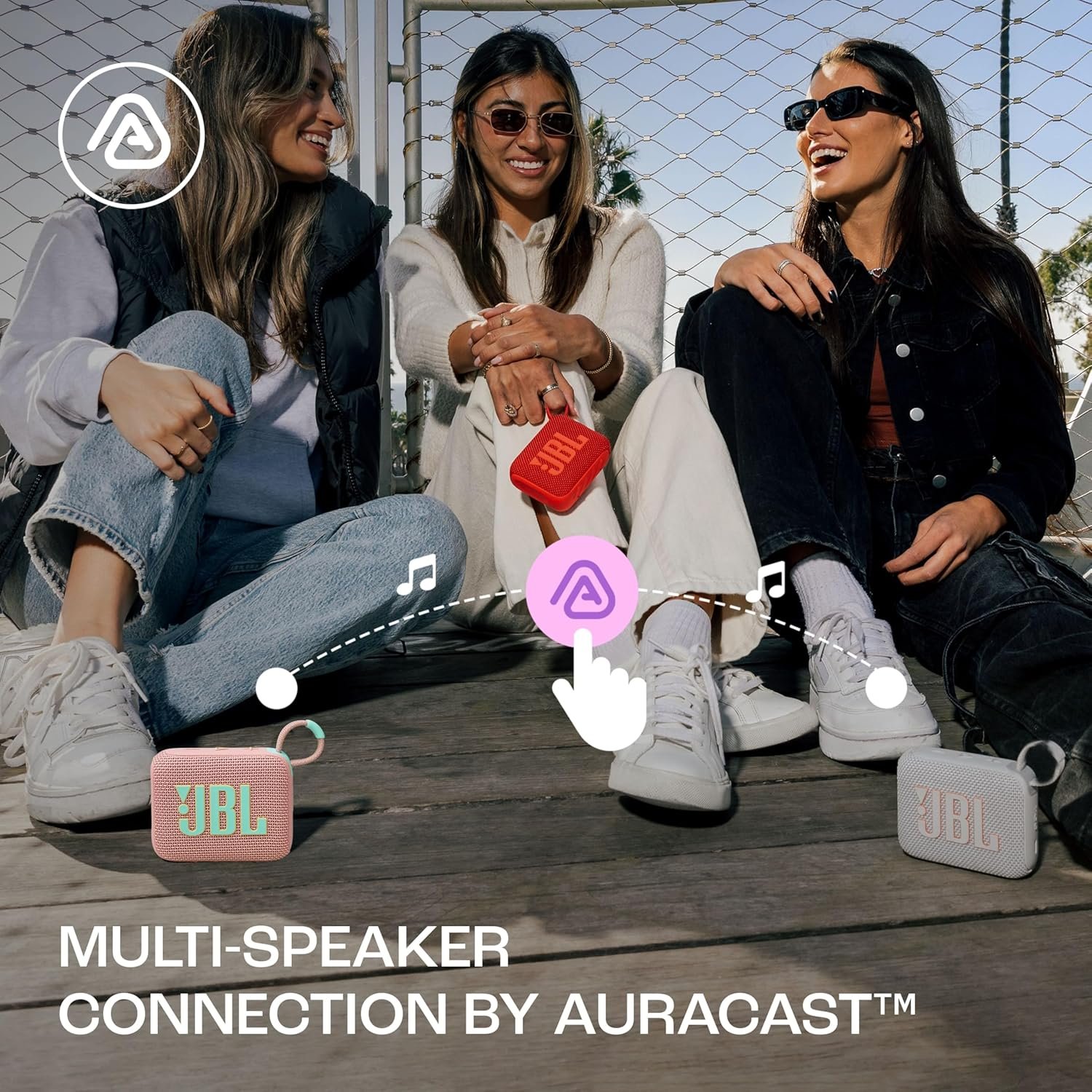 Connect multiple speakers: Pair two Go 4 for stereo audio or connect multiple speakers wirelessly with JBL Auracast for even bigger sound during a fun day trip or a night under the stars