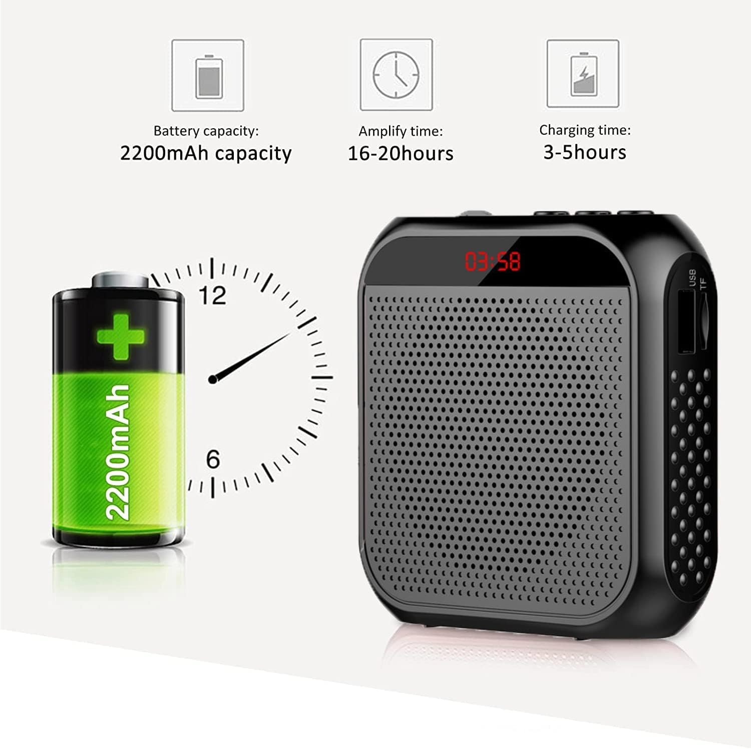 Mini voice amplifier has a built-in a 2200mAh large lithium battery, that allows the portable speaker with microphone to take 4-6 hours to fully charge, but plays up to 20 hours of amplify time and up to 13 hours of music playtime.