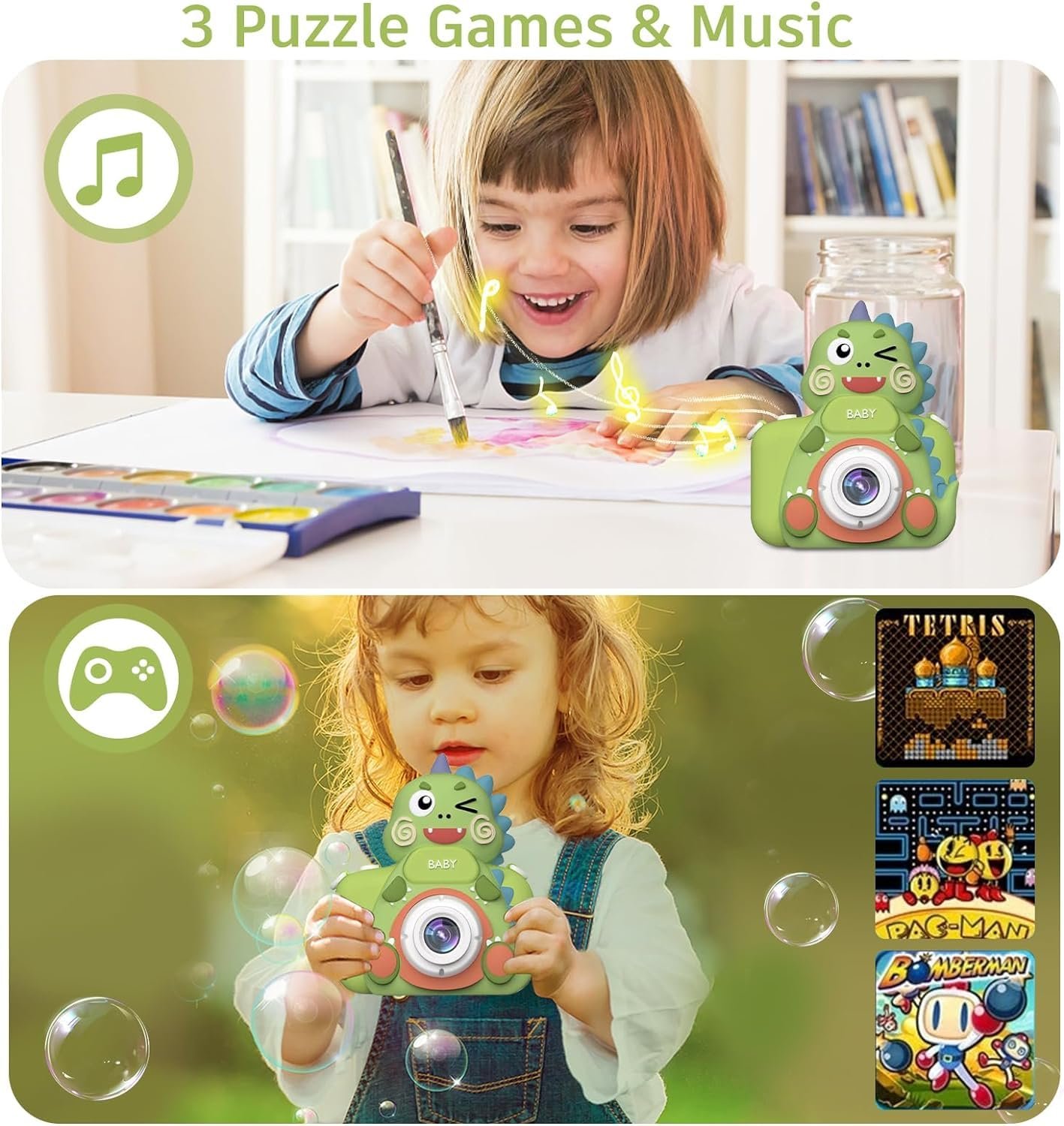 【Perfect Dinosaur Gift Toy for Kids Boys Girls】 Record every moment of life.This cute dinosaur cartoon kids toy camera is a great choose as a excellent birthday gift, christmas gift, new year gift or holiday gift for your children boys and girls age 3-12 years. It supports selfie, video mode and 3 puzzle games, can develop kids imagination and creativity, enhance the fun of parent-child interaction.