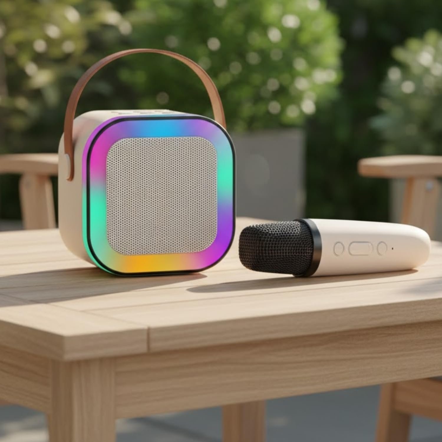 Mini Karaoke Machine: Enjoy powerful, clear sound with dual speakers, LED lights, and five fun voice modes (Original, Female, Male, Baby, Monster). Includes a wireless mic with adjustable echo.