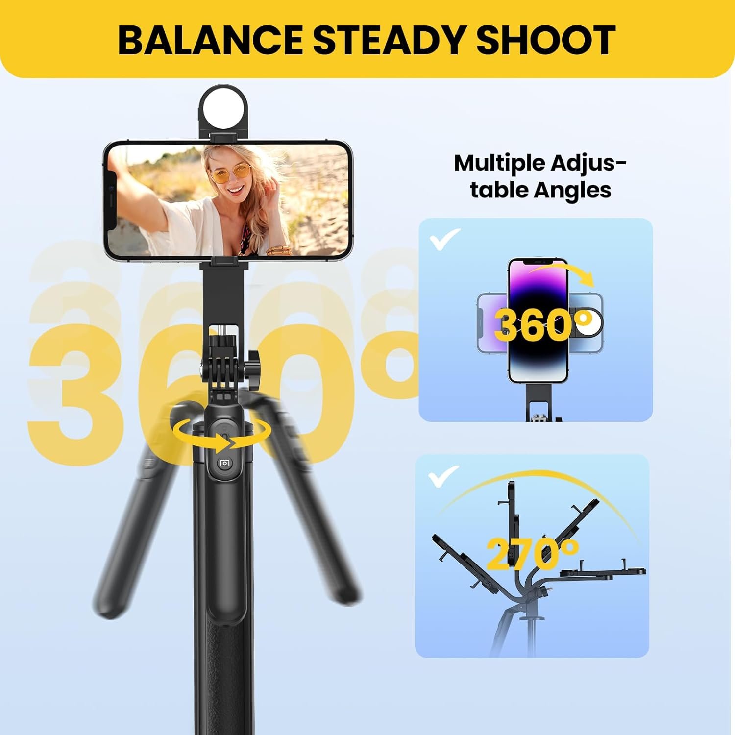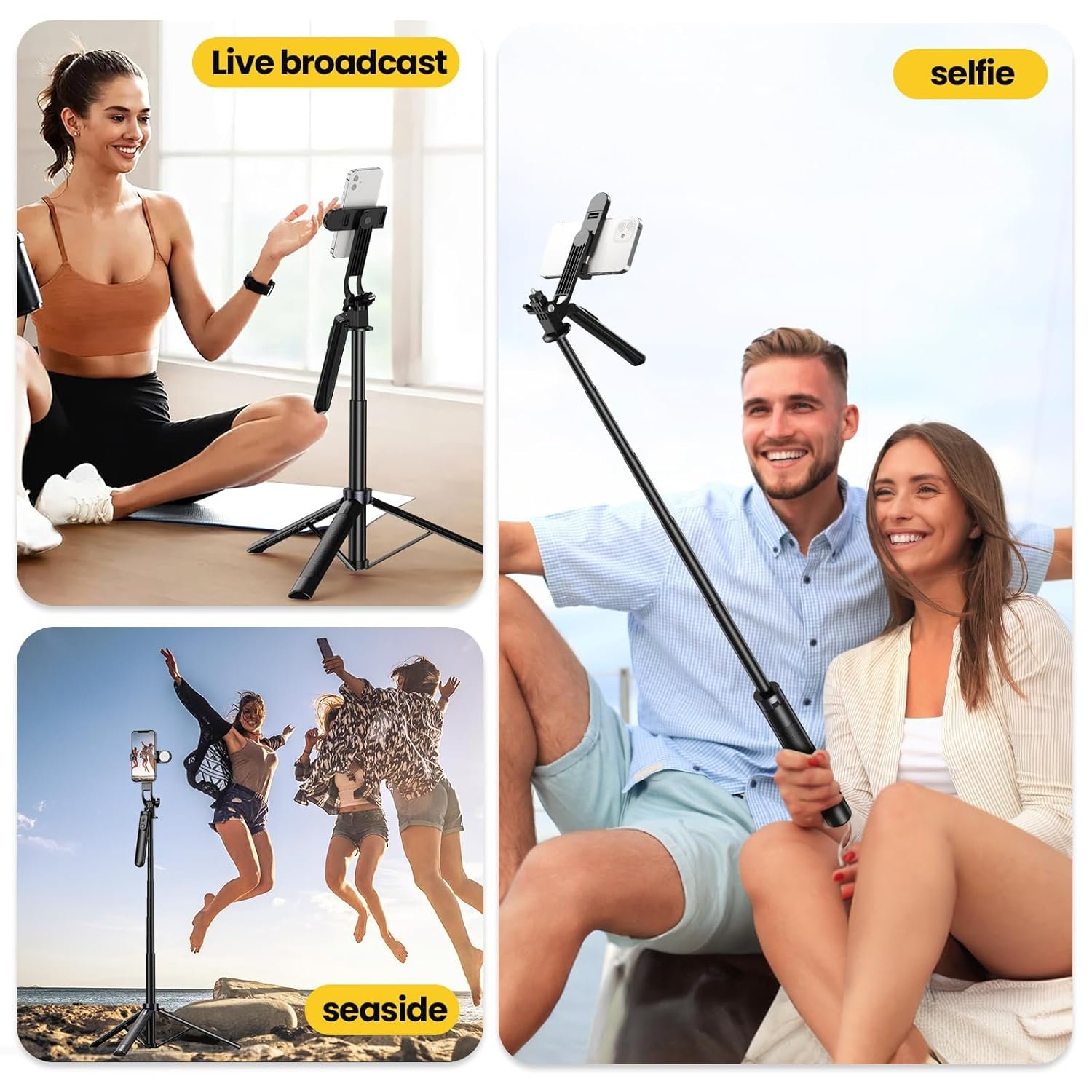 I recently purchased this selfie stand, and I must say it has exceeded my expectations in every way!First, the build quality is solid. The tripod legs are sturdy and don’t wobble, even on uneven surfaces. It holds my phone (and sometimes even a small camera) securely without any fear of it tipping over.The adjustable height and 360° rotation head make it super versatile. Whether I’m shooting reels, doing video calls, or taking group selfies, it adjusts to the perfect angle effortlessly. The extendable stick also gives enough height for overhead shots or wide angles.What I especially loved is the Bluetooth remote – it works seamlessly with my Android phone and makes hands-free clicking a breeze. Great for solo travel or shooting content without needing help.