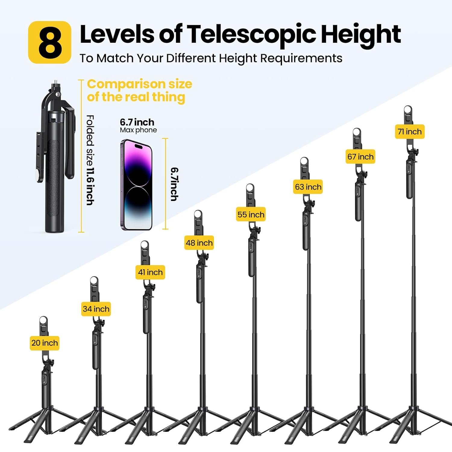 【Aluminum Extendable Selfie Stick & 3-in-1 Design】KINGONE Selfie Stick with Tripod Stand, 7-section adjustable telescopic pole, extends up to 1.8 meters for a wider shooting angle. Made of aerospace aluminum alloy, sturdy and durable, lighter than other stainless steel selfie stick. Stable reinforced tripod, take umbrella frame structure and triangular compound structure design, more stable. Can be used as selfie stick & tripod & cell phone holder. Capture your wonderful moments on the go