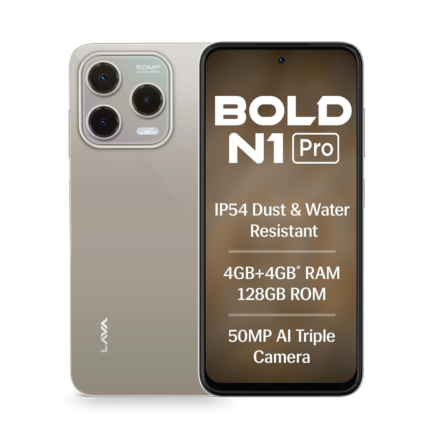 Lava Bold N1 Pro (Titanium Gold, 4 GB RAM, 128 GB Storage)| Bigger 6.67″ HD+ IP54 Display | 120 Hz Refresh Rate | 50 MP AI Triple Rear Camera | 8 MP Front Camera| 5000 mAh Battery | Charger in Box