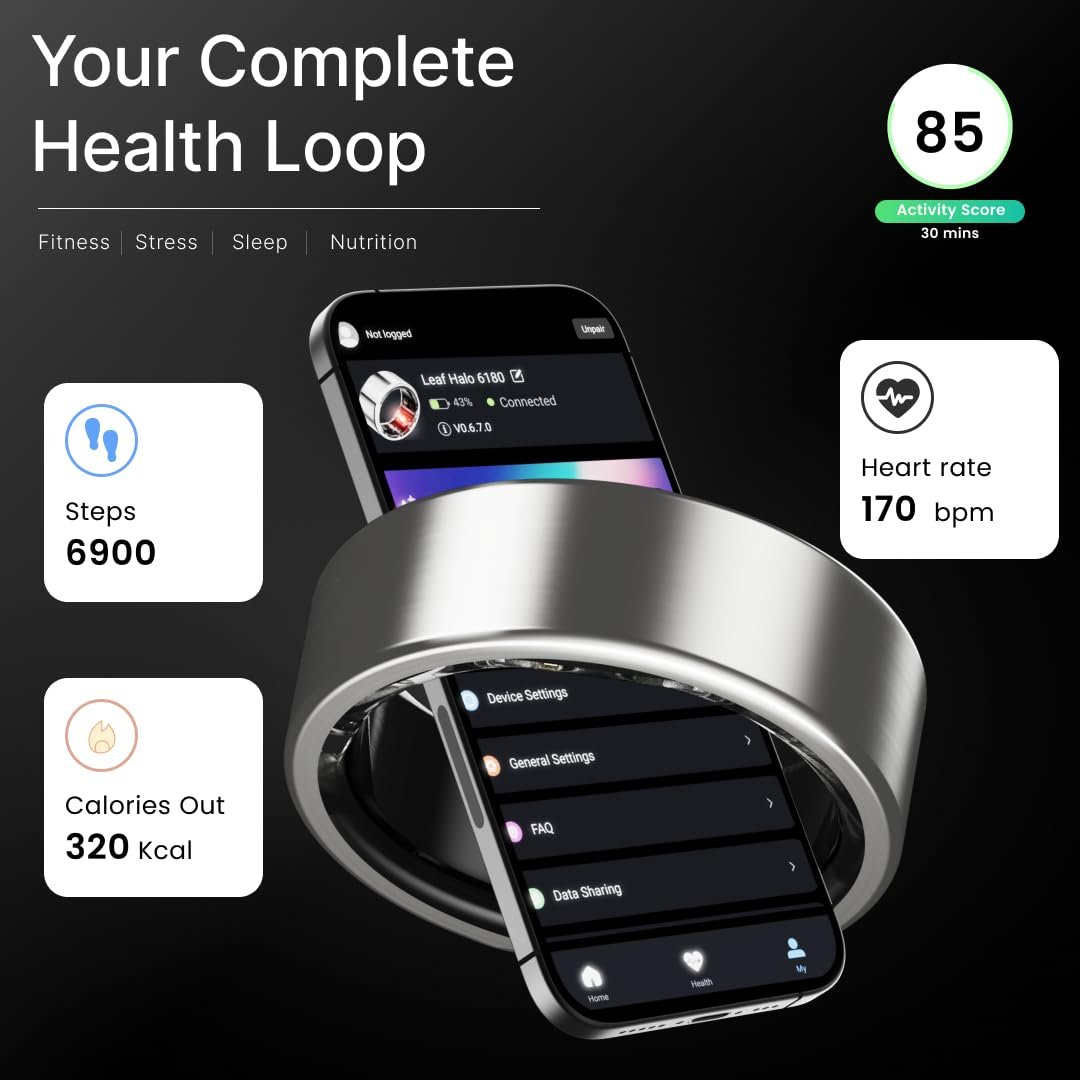 ACTIVITY TRACKING: Track your heart rate, steps, and workouts throughout the day, and get a comprehensive Activity Score that reflects your overall movement. Choose your workout mode, and the Leaf Halo Smart Ring measures the intensity and effectiveness of your exercise with a dedicated Workout Score.