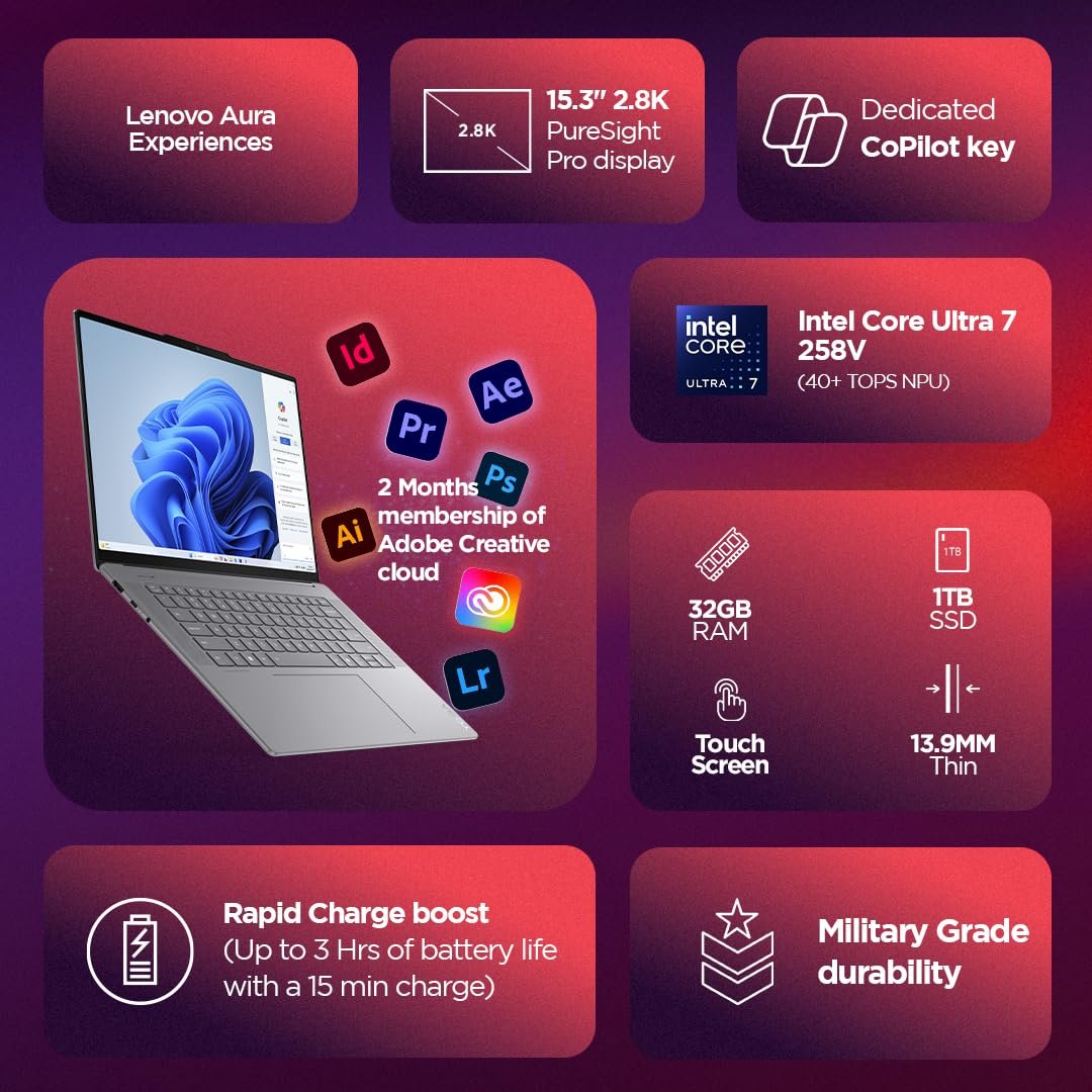 I recently acquired the Lenovo Yoga Slim 7 Aura Edition with the Intel Ultra 5 226V processor, and it has proven to be an excellent choice for a student and professional alike. While not a powerhouse for intensive tasks like heavy gaming, its performance is more than sufficient for everyday productivity and multimedia consumption.The standout feature of this laptop is undeniably its display. The screen is stunning, with vibrant colors and sharp details that make everything from editing documents to watching movies a visual treat. My only minor gripe is the 60Hz refresh rate, as a higher refresh rate would have made for an even smoother user experience.The build quality is another strong point. The laptop feels premium and durable, thanks to its robust aluminum body. The keyboard is a joy to type on, with comfortable, well-spaced keys that are perfect for long writing sessions. Battery life is also exceptional, easily getting me through a full day of work or classes with its 12-13 hours of uptime.However, the best part of this laptop is its audio system. The four speakers, enhanced with Dolby Atmos support, deliver a rich and immersive sound experience that is a rarity in laptops of this class. The audio quality is crystal clear, making it a pleasure to listen to music or watch movies without needing external speakers.All things considered, I would highly recommend the Lenovo Yoga Slim 7 Aura Edition. It’s a fantastic all-around laptop that balances performance, premium features, and portability. I give it a solid 4 out of 5 stars.