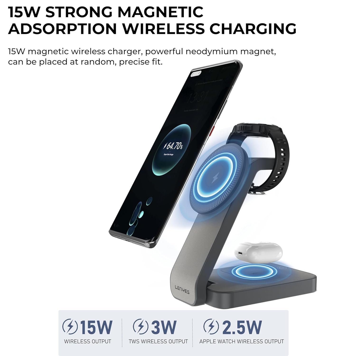 All-in-One Wireless Charging: Charge your smartphone (15W), TWS earbuds (3W), and Apple Watch (2.5W) simultaneously with a single sleek and efficient charging dock.