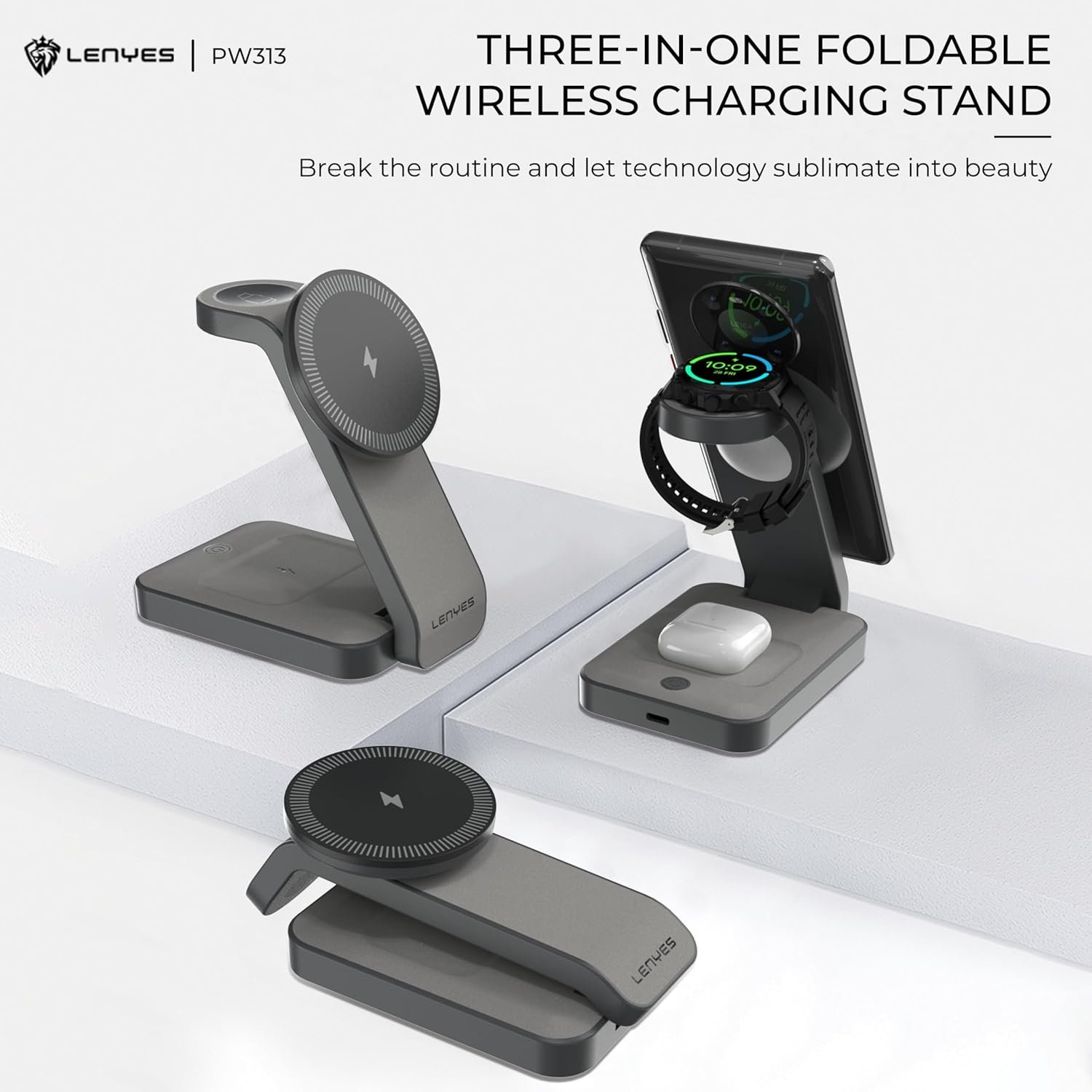Lenyes PW313 3-in-1 Foldable Wireless Charging Dock with 15W Fast Charge for Mobile, 3W for TWS Earbuds, 2.5W for Apple Watch, Built-in Night Light with 3 Brightness Levels, ABS+Cotton Fabric Finish