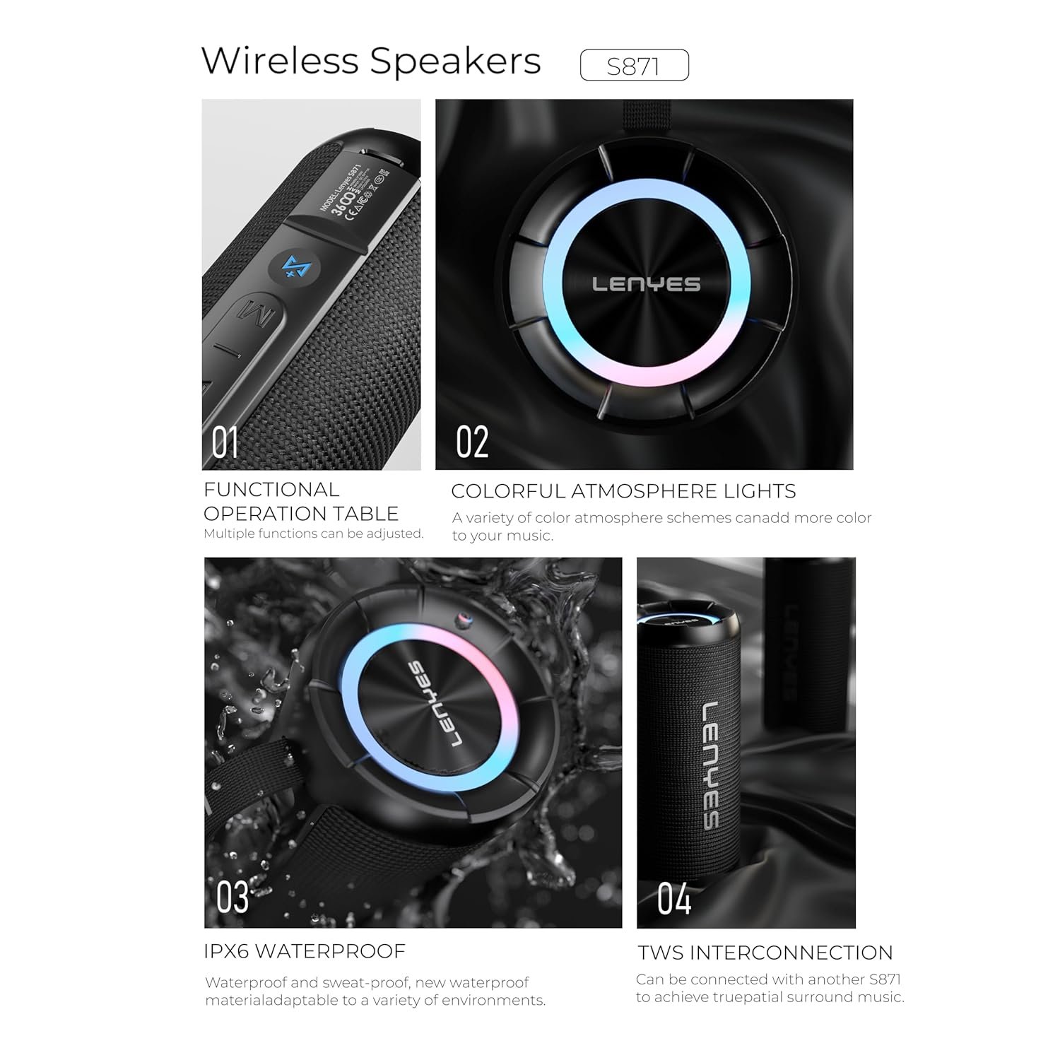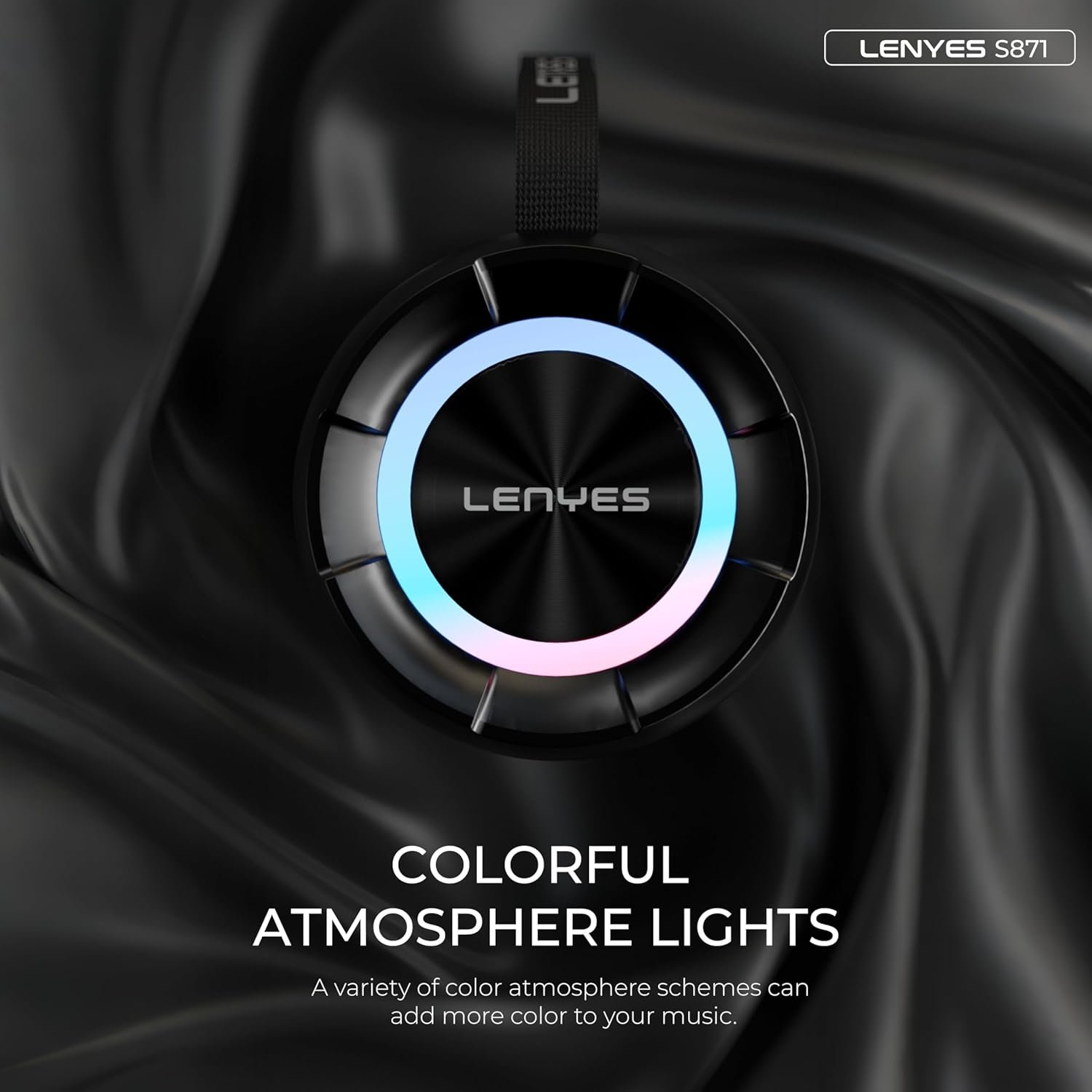 Lenyes S871 Bluetooth Speaker | 60W Peak Power | Bluetooth v5.3 | 10H Playtime | Built-in Mic | TWS Mode | RGB Lights | IPX6 Water-Resistant | TF, AUX & USB-C Audio App Compatible (Black)