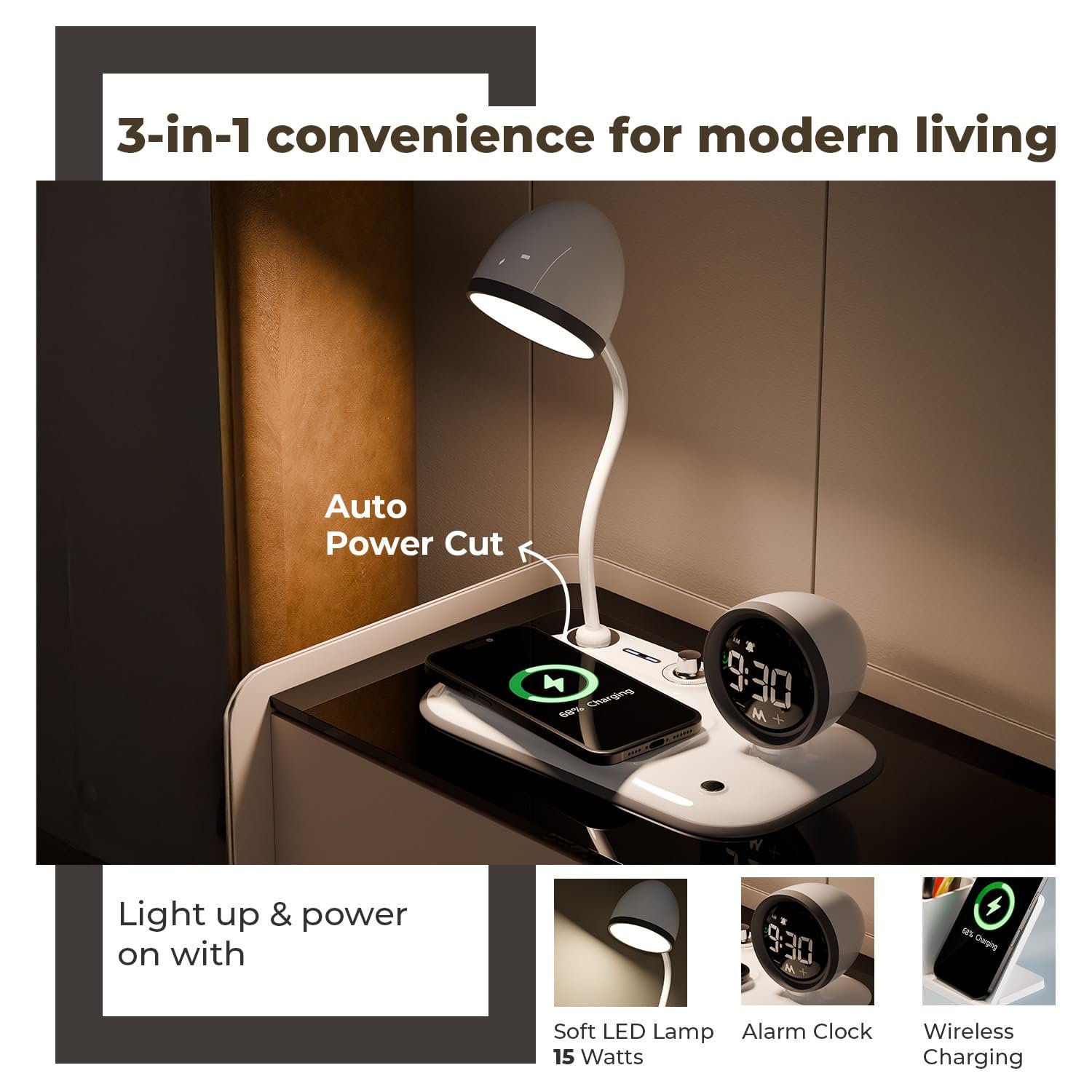 3-in-1 Multifunctional Design : A perfect blend of wireless charging pad, LED desk lamp, and digital alarm clock in one compact device, making it ideal for home, office, and bedside use.
