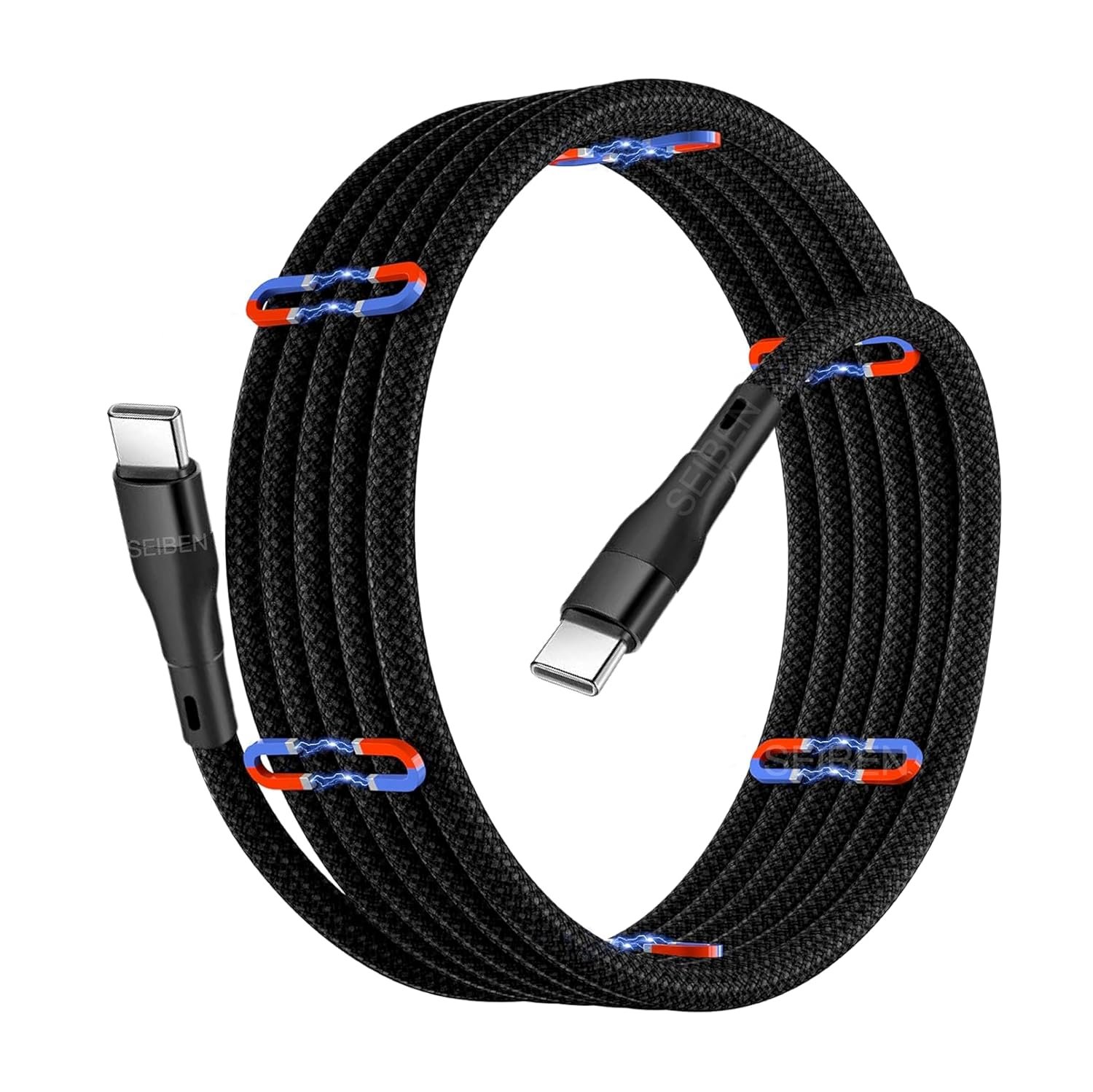 🧲【Coil the Cable in Seconds】: SEIBEN Black Type C to Type C O-MagCable comes with a magnetic coiled design, which keeps everything well organised when not in use. Actual product may vary from representational media shown