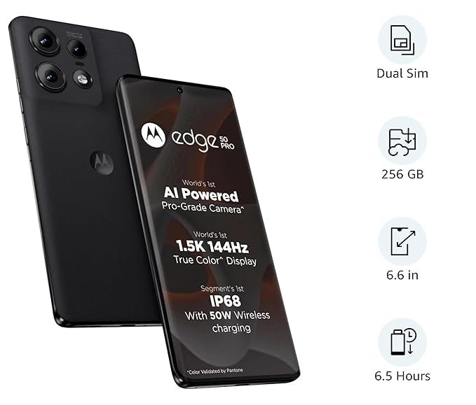 The Motorola Edge 50 Pro 5G in Black Beauty is a mid-range smartphone featuring a premium design with a vegan leather finish and metal frame. It offers a powerful combination of a Snapdragon 7 Gen 3 processor, 12 GB of RAM, and 256 GB of storage. A standout feature is its Pantone-validated 1.5K pOLED display and camera system, which is designed to ensure true-to-life colors. Key features Design and display Color and materials: The “Black Beauty” variant features a black silicone vegan leather back and a sandblasted aluminum frame. Durability: The device has an IP68 rating for water and dust resistance. pOLED display: The curved 6.7-inch Super HD (1.5K) pOLED screen has a 144 Hz refresh rate for smooth scrolling, HDR10+ support, and a peak brightness of 2000 nits. True Color: It is the first smartphone to feature a Pantone-validated camera and display, which ensures accurate color and skin-tone reproduction. Performance Processor: A Snapdragon 7 Gen 3 Mobile Platform (octa-core at up to 2.63 GHz) powers the phone, providing smooth performance for multitasking and gaming. Memory and storage: This version includes 12 GB of RAM and 256 GB of internal storage, which uses UFS 2.2 technology. OS and software: It runs on Hello UI, a clean and near-stock version of Android 14, and includes Motorola’s AI-powered camera and Style Sync features. Updates: Motorola promises three years of OS upgrades and four years of security patches. Cameras Rear camera system: The versatile triple-camera setup features a 50MP main sensor with a wide f/1.4 aperture and optical image stabilization (OIS), a 13MP ultrawide lens that doubles as a macro camera, and a 10MP telephoto lens with 3x optical zoom. Front camera: A 50MP autofocus selfie camera is included for high-resolution self-portraits and video calls. AI features: The camera uses AI-powered features for photo enhancement and video stabilization. Battery and charging Battery capacity: It is equipped with a 4,500 mAh battery. Fast charging: It supports 125W wired TurboPower charging and 50W wireless charging. The wired charger can provide a full charge in under 20 minutes. Wireless PowerShare: The phone also features 10W wireless power-sharing.