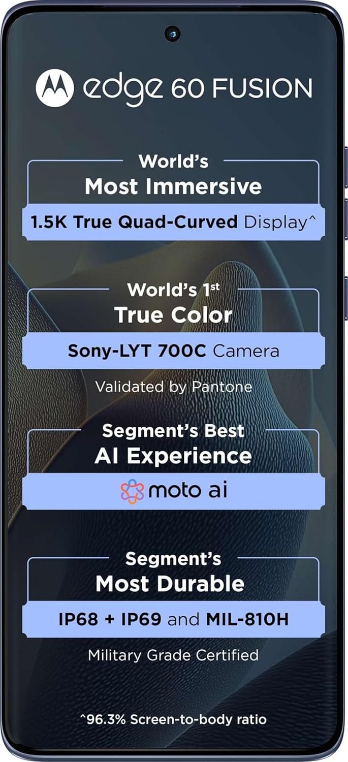 Motorola Edge 60 Fusion delivers industry-first features like the Sony-LYT 700C color-accurate camera, ultra-bright curved display, water resistance rated IP68 and IP69, and MediaTek Dimensity 7400 chipset. With powerful Moto AI integration, it offers top-tier camera, display, durability, and smart performance in one slim design.
