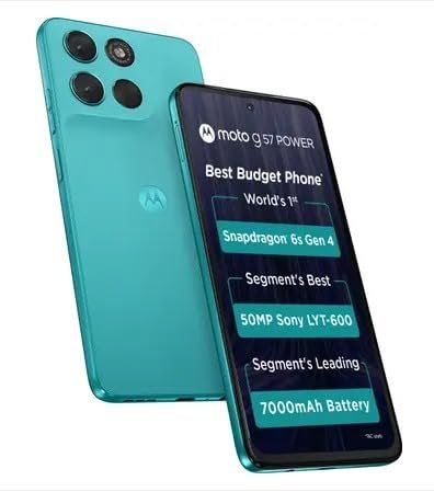 moto g57 power 5G is built for users who want a big battery, smooth display and clean software in one dependable phone. The Snapdragon 6s Gen 4 4 nm processor, paired with 8 GB LPDDR4X RAM and 128 GB UFS 2.2 storage, delivers responsive performance for social apps, browsing, work and casual gaming, while RAM Boost lets you extend memory virtually when you multitask heavily. The 6.72 inch FHD plus LCD with 120 Hz refresh rate keeps scrolling and animations fluid, and high brightness helps the screen stay readable outdoors. A 50 MP Sony LYT 600 main camera and 8 MP ultra wide camera cover detailed shots and wider scenes, supported by moto ai features and Google Photos tools on selected markets to refine portraits and low light photos. An 8 MP front camera with up to 2K video is ready for clear video calls and social content. A large 7000 mAh silicon carbon battery is the highlight, designed to last long days of streaming, calling and navigation, backed by 30 W TurboPower fast charging so you can get back to high battery levels faster. The phone adds a Pantone inspired vegan leather back for a comfortable grip, IP64 dust and splash resistance and MIL STD 810H testing for extra reassurance. Running Android 16 with a promised upgrade to Android 17 and three years of security updates, moto g57 power 5G aims to stay secure and smooth over the long term for everyday Indian 5G use.
