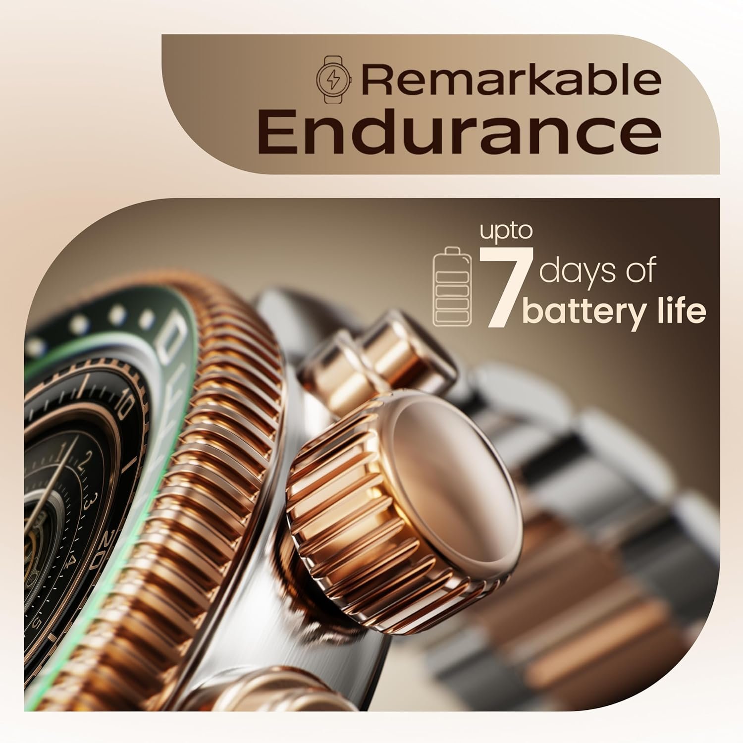 This smartwatch looks incredibly premium, especially with the metal finish and bold design. The display is bright, sharp, and easy to read even outdoors. I really liked the rotating bezel – it gives a classy feel and makes navigation smooth. Build quality is solid and feels durable on the wrist. Overall, a great value for money and definitely eye-catching.