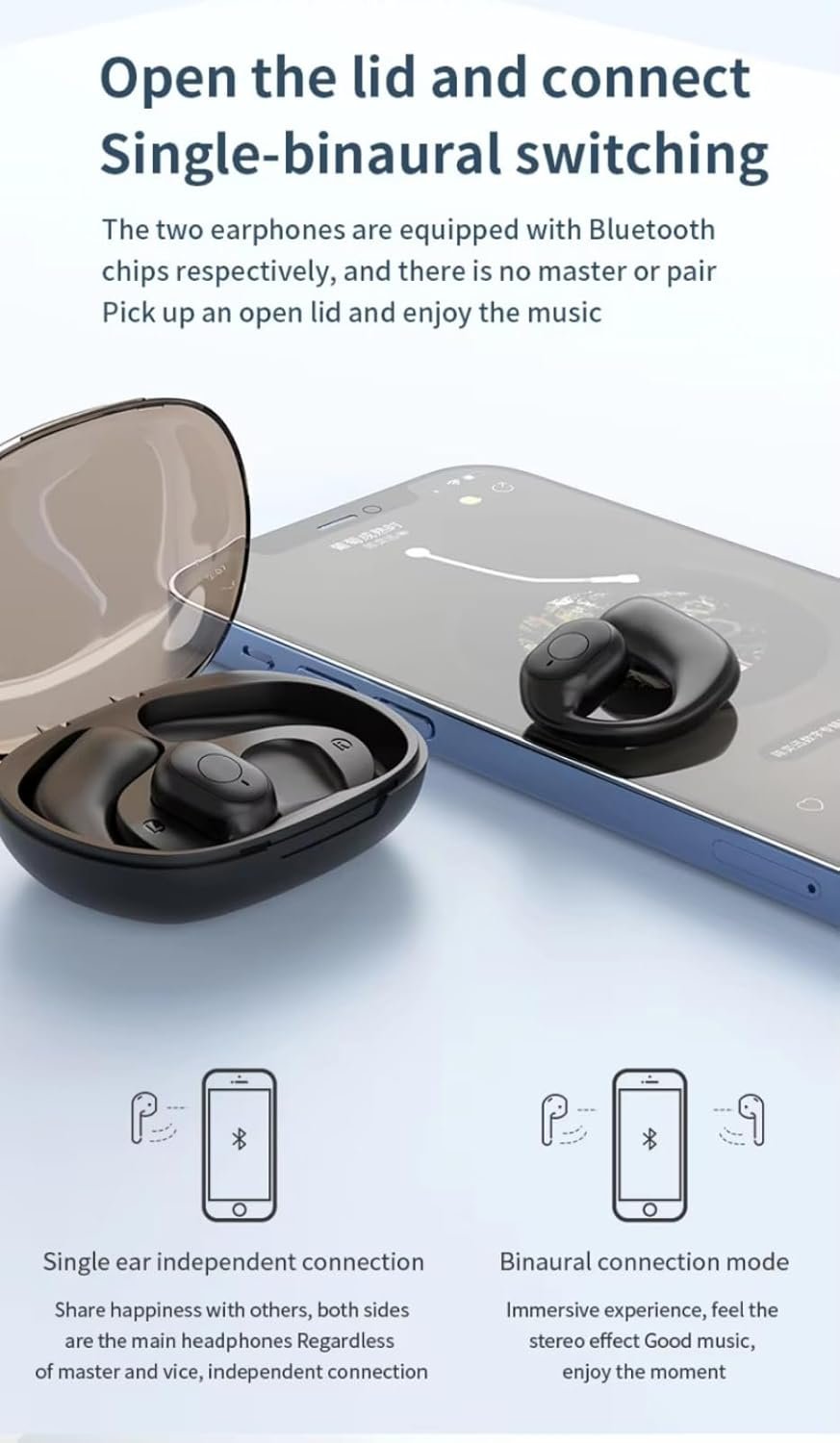 🎵Open-ear design for health and safety- Wireless earbuds for phones the open-ear design that does not go into the ear protects your ear canal clean liness and hearing without harming your eardrum; you can be aware surroundings to ensure safety.