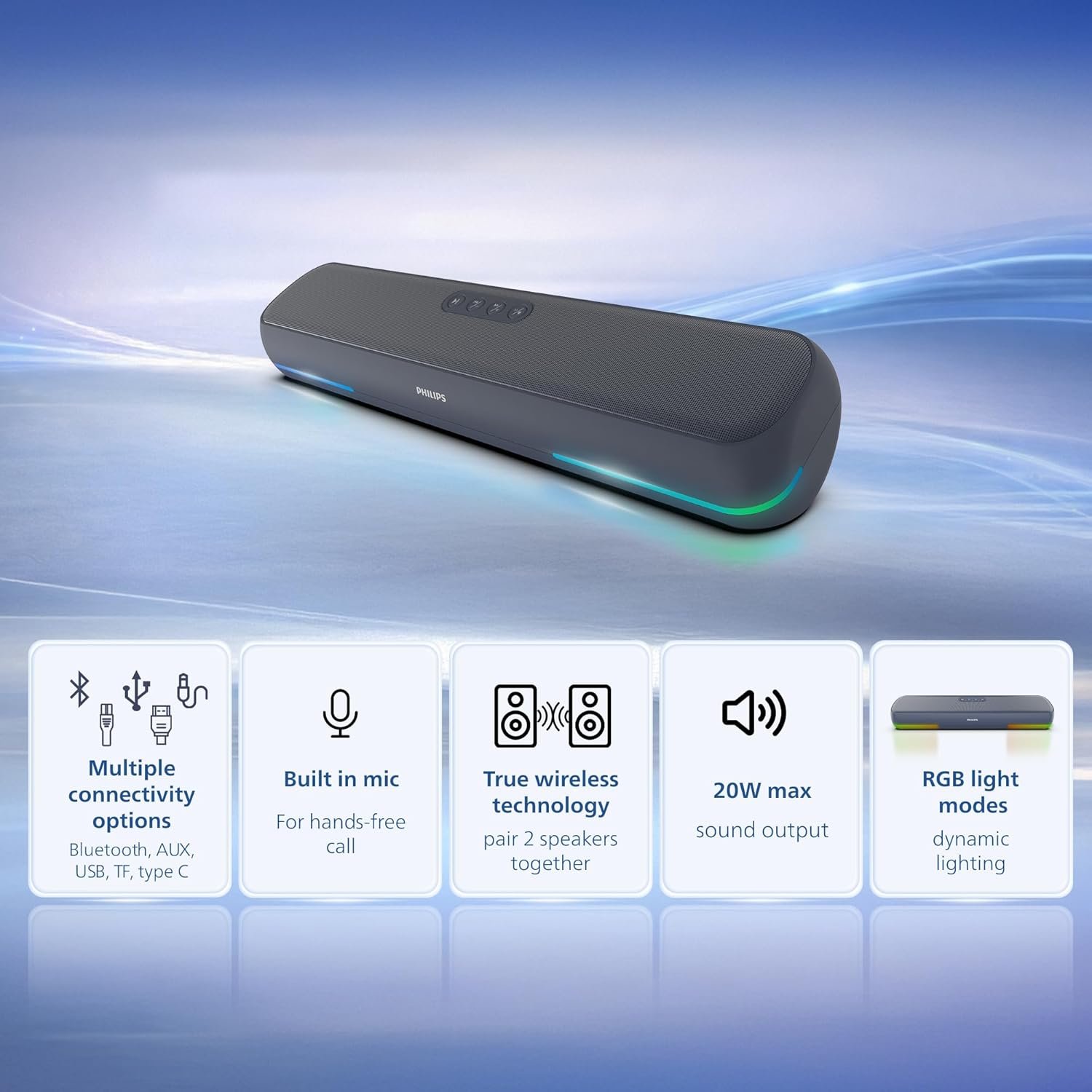 Multiple Playback Modes: Supports TWS pairing, AUX input, USB drive, TF card playback, and built-in mic with voice assistant for smart, versatile audio control.