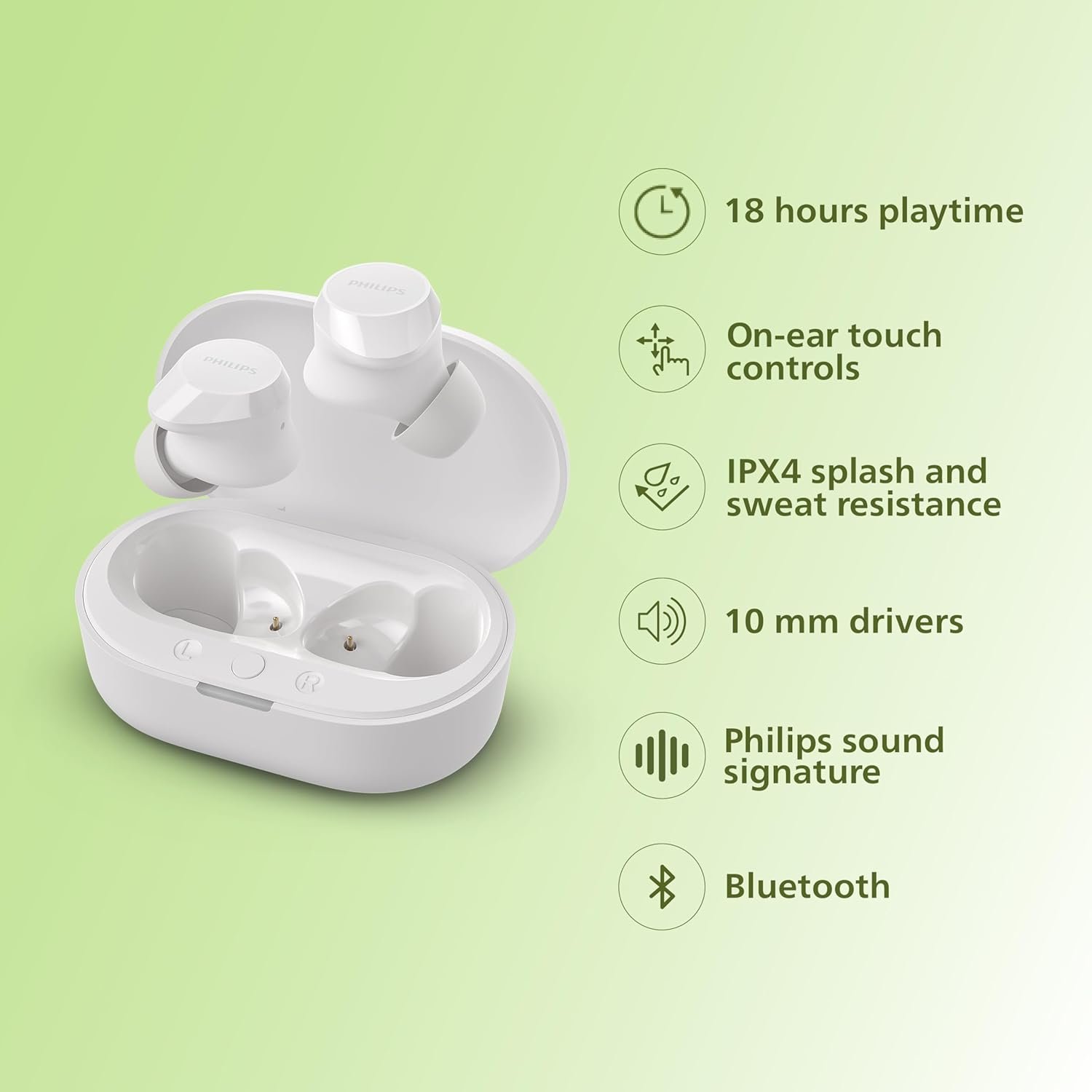 PHILIPS TAT1209WT/00 True Wireless Earbuds, in-Ear Active Noise Cancelling Bluetooth v5.3 Earphones with Mic, 18H Play Time, Shank Shape, IPX4, Touch Controls & Charging Case for iPhone/iPad (White)