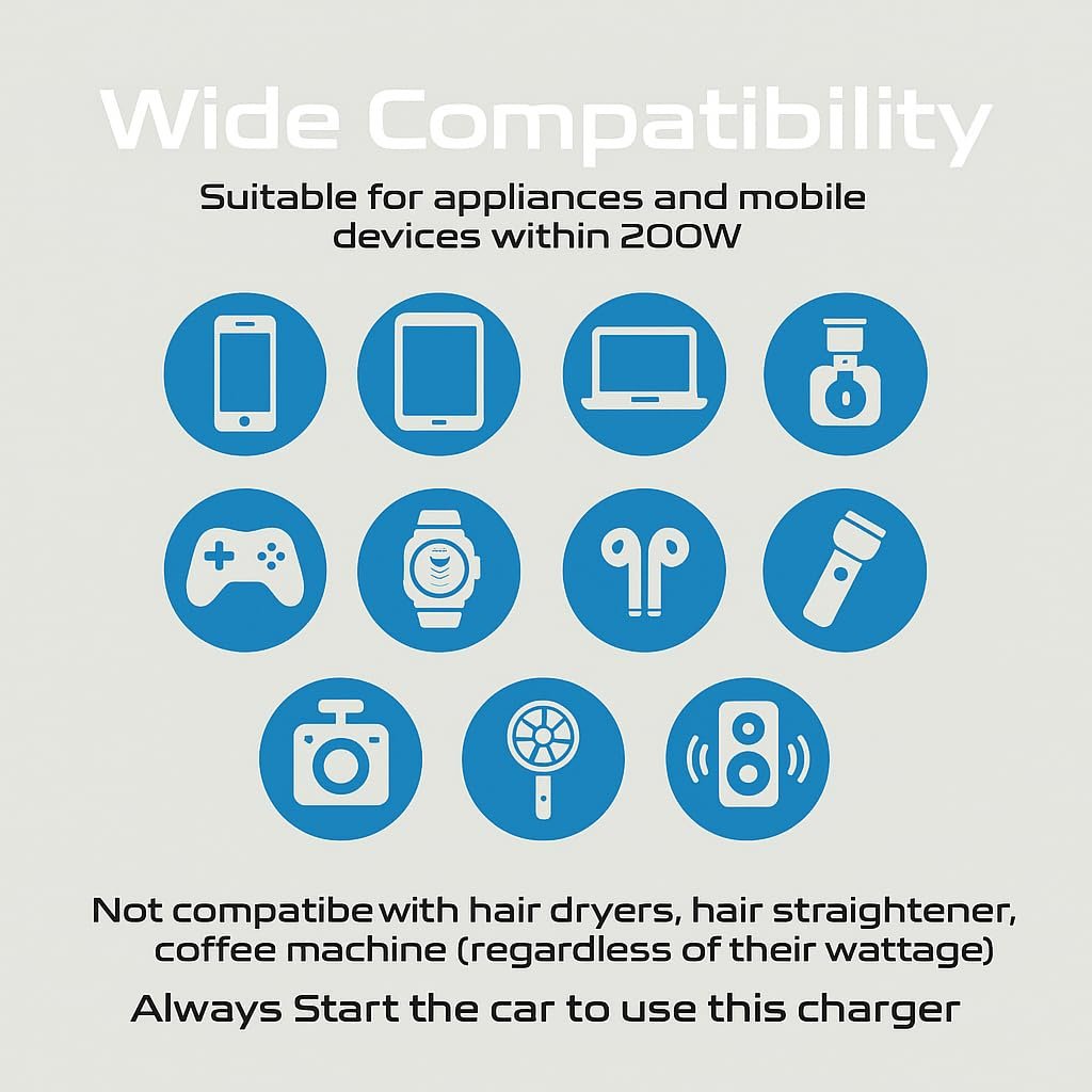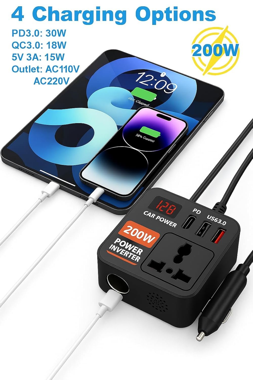 200W Continuous Power Output with 400W Peak Delivers stable 200W of continuous AC power from your 12V car socket — ideal for laptops, mini fans, gaming consoles, and other road-trip essentials.
