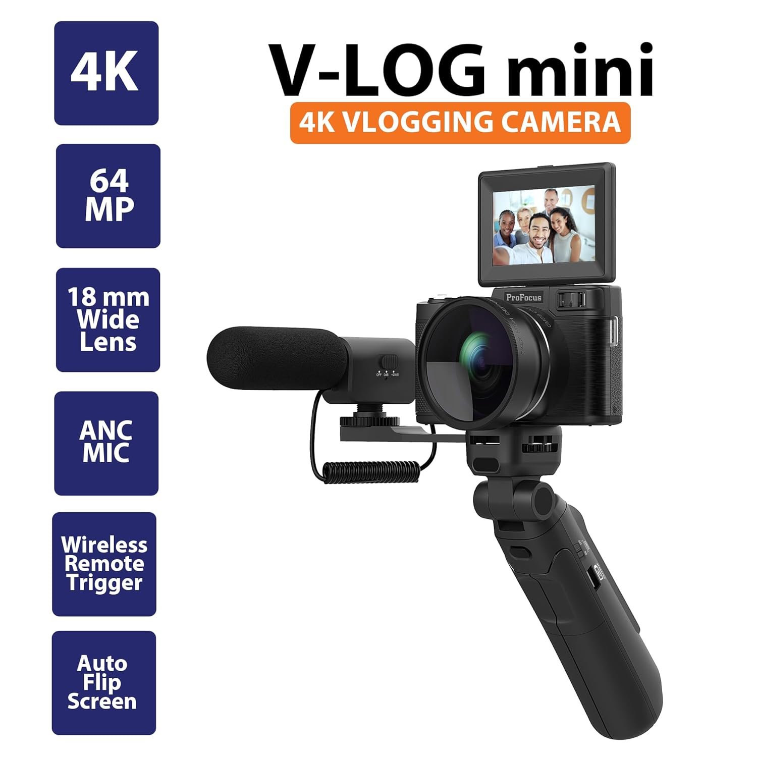 ProFocus Vlog-Mini Camera 4K Auto-Flip Sceen Perfect Vlogging Kit for Content Creators & Travel Influencers with 64GB MicroSd Card, 2 Batteries, 1 External Microphone, Tripod & Wireless Remote