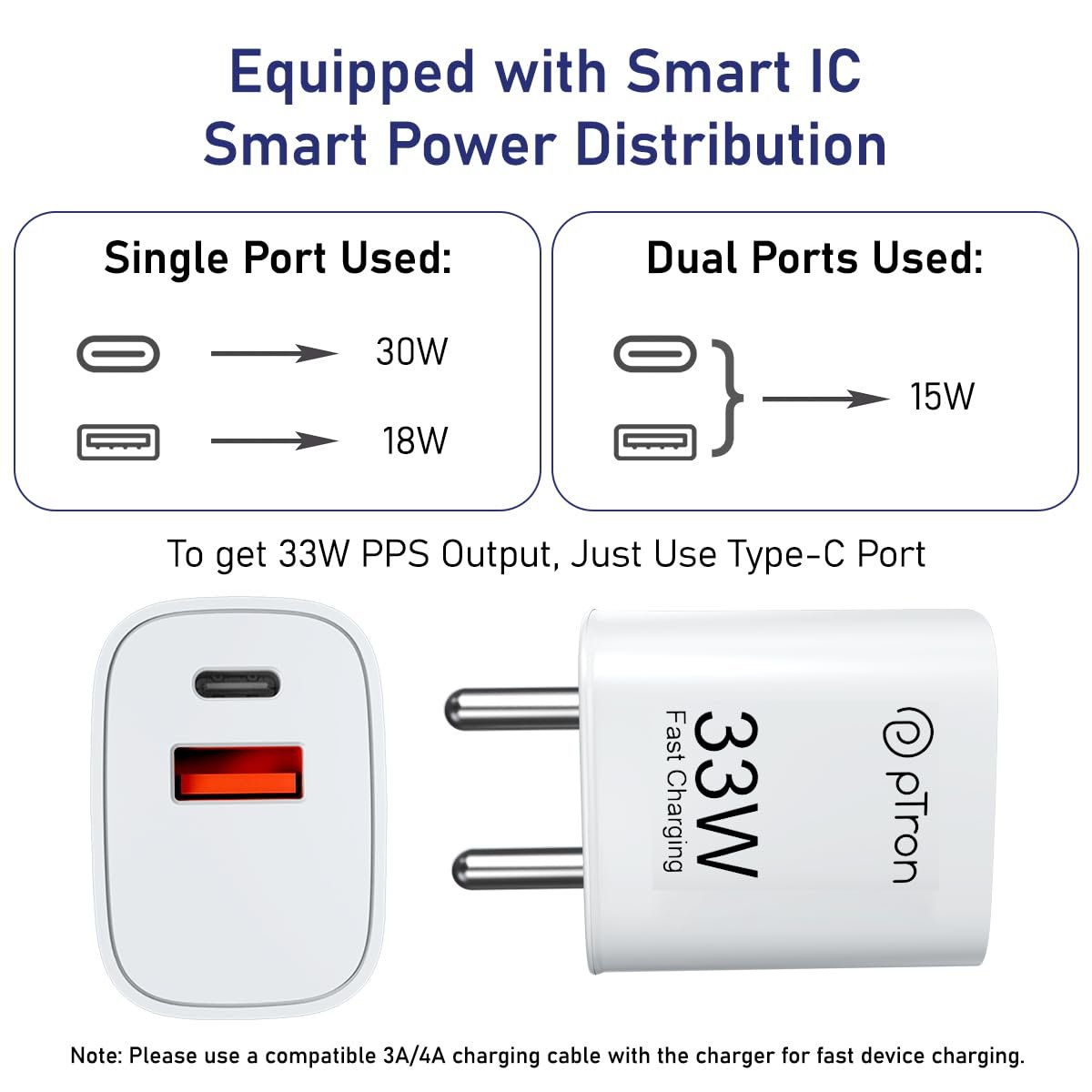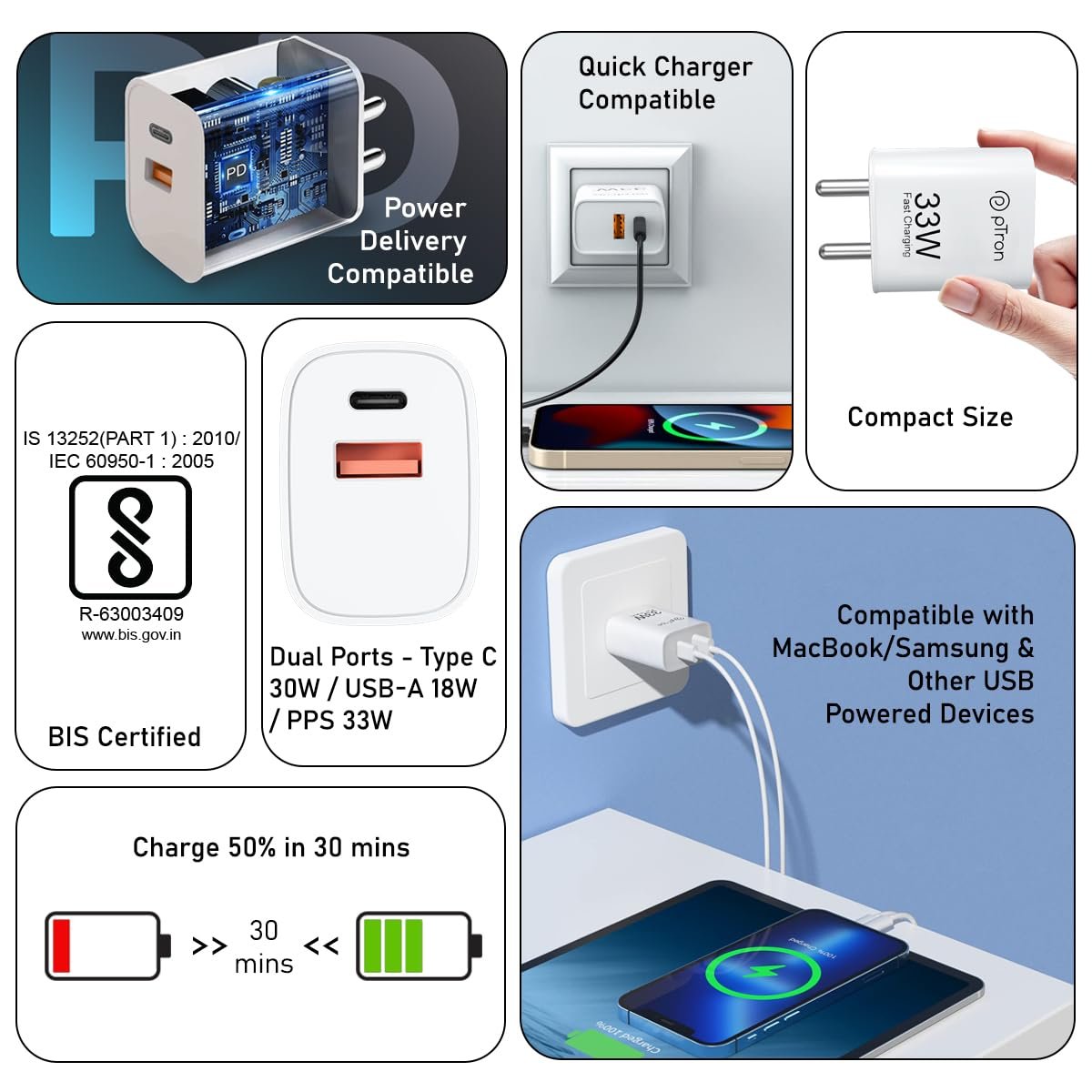 Made in India 33W Fast Wall Charging Adapter is compatible with Apple, Samsung AFC, QC2.0, QC3.0, DCP, FCP, PD3.0, PPS 33W & MacBook Superfast charging.