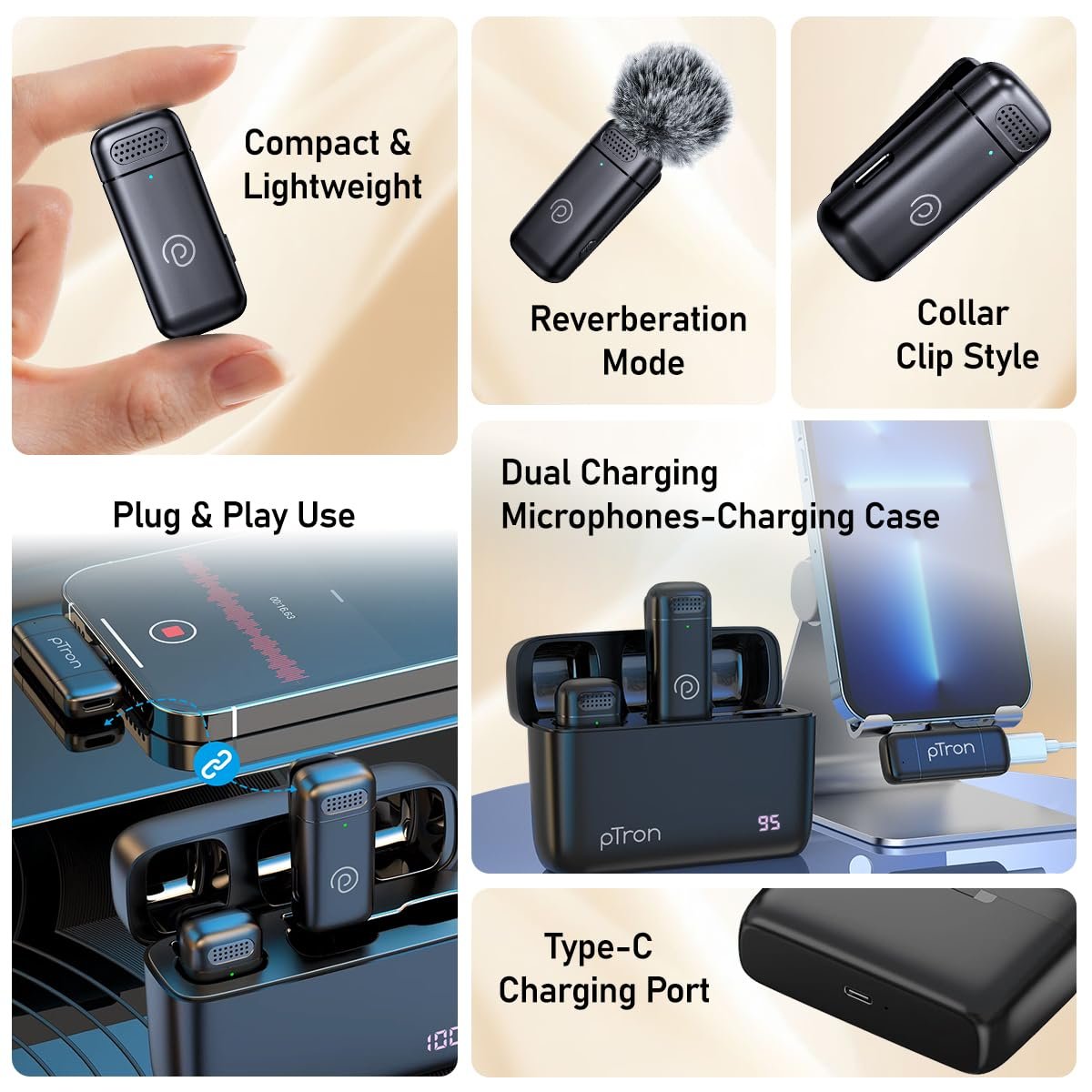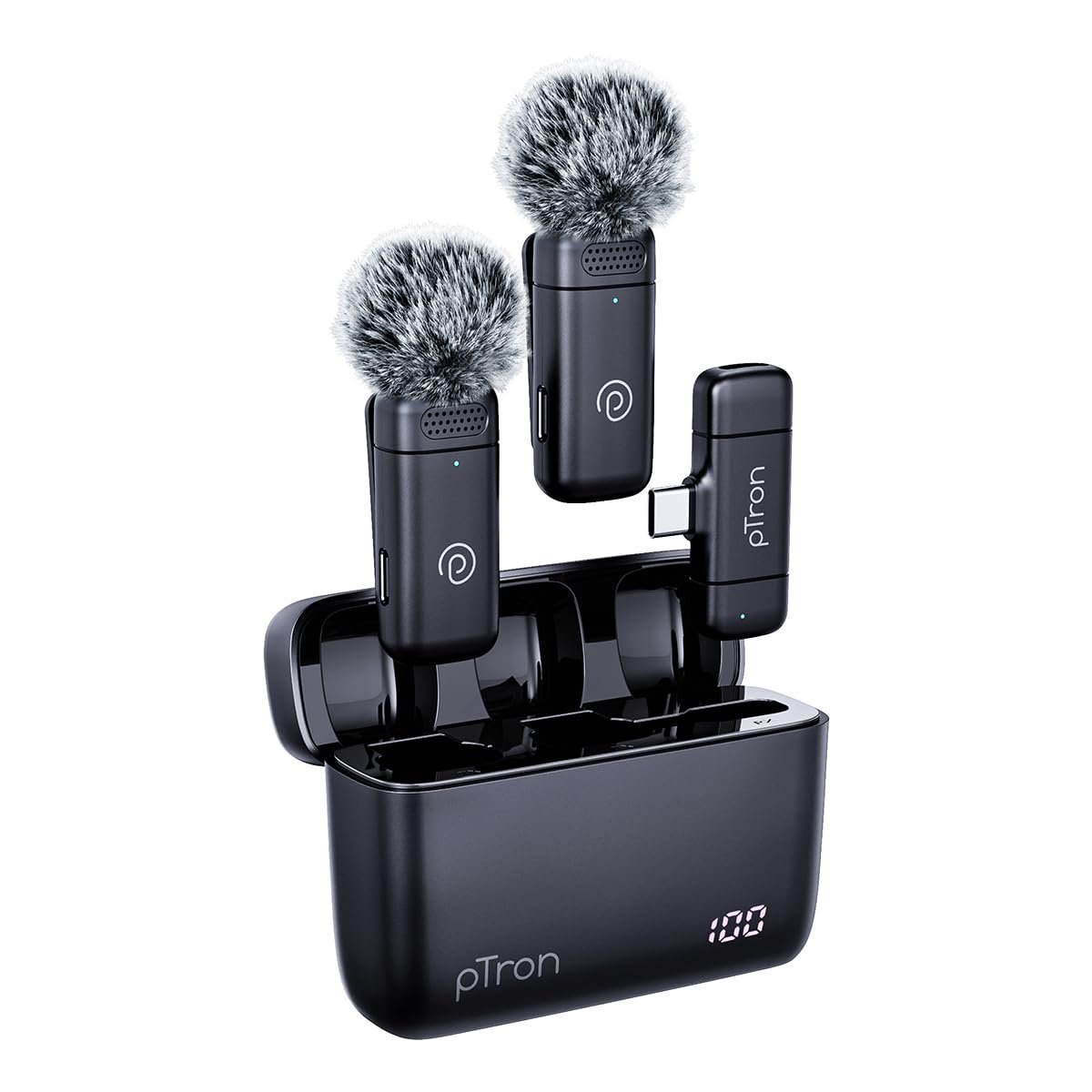 pTron KWM-2 Type C Wireless Microphone with Charging case w/Noise Cancellation, 48Hrs Battery, 20m Wireless Range, Collar Mic for DSLR/iPhone/Android, Vlog, Streaming/Zoom Meeting (Black)