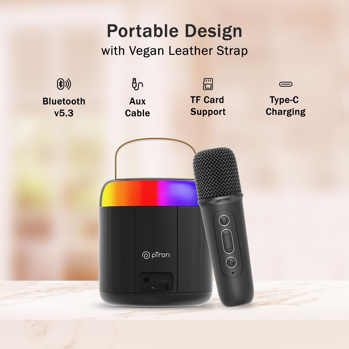 Vibrant RGB LED Lighting Effect for Party Vibes | Enjoy 6 Hours of Music Playtime on a single charge | Vegan Leather Strap for Easy Portability | Type-C Fast Charging Port (DC5V-1A max.)