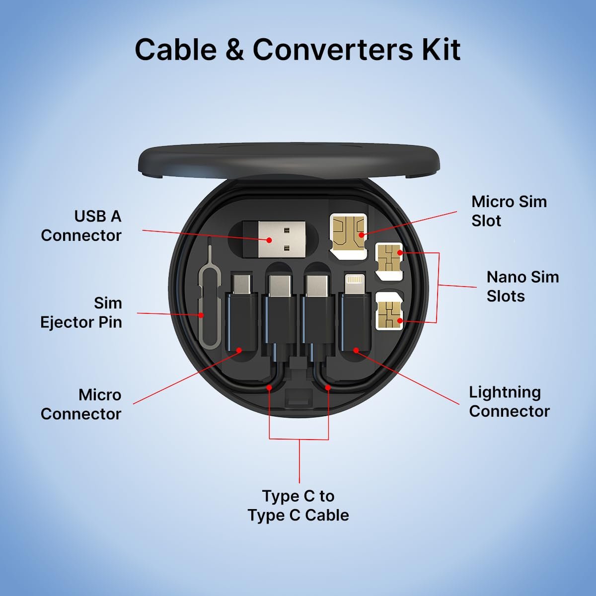 pTron Nexo 60W Multifunctional Fast Charging Data Cable Kit w/Conversion Set USB A & Type C to Male Micro/Type C/iOS, Data Transfer, SIM Storage, SIM Eject Pin, Pocket Mirror & Phone Holder (Black)